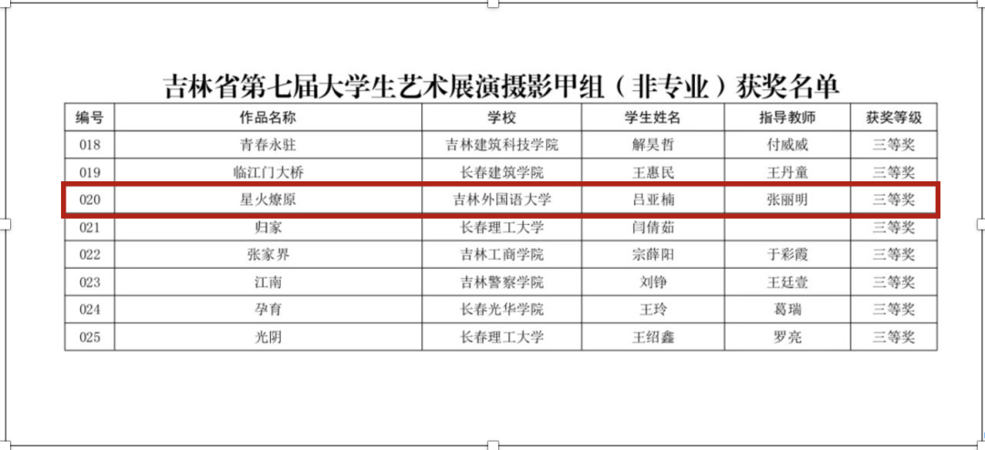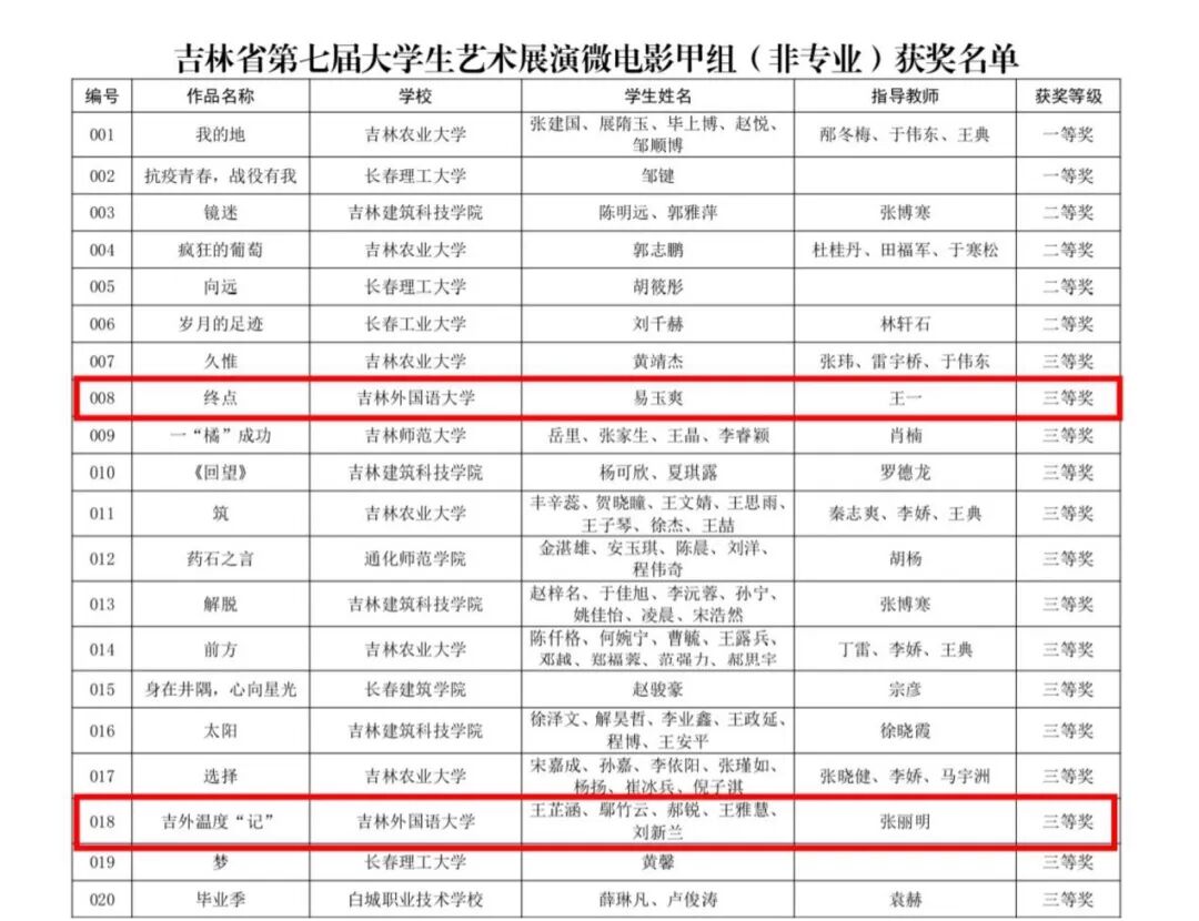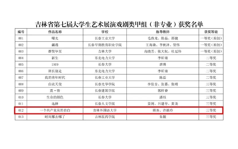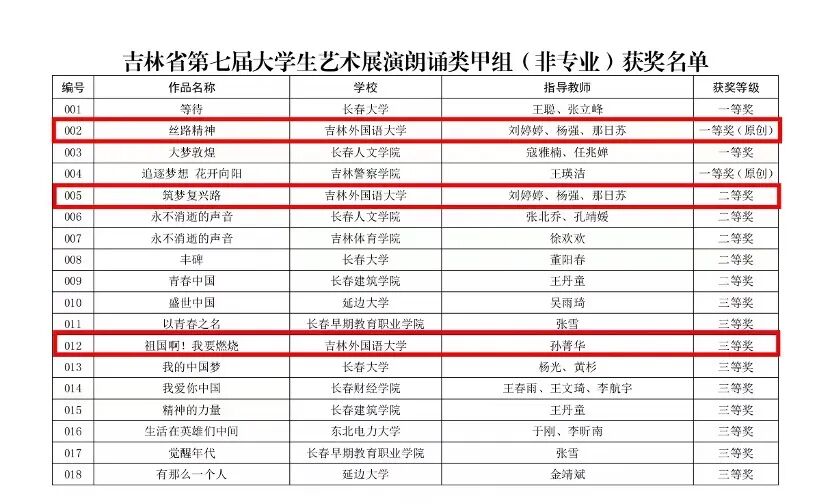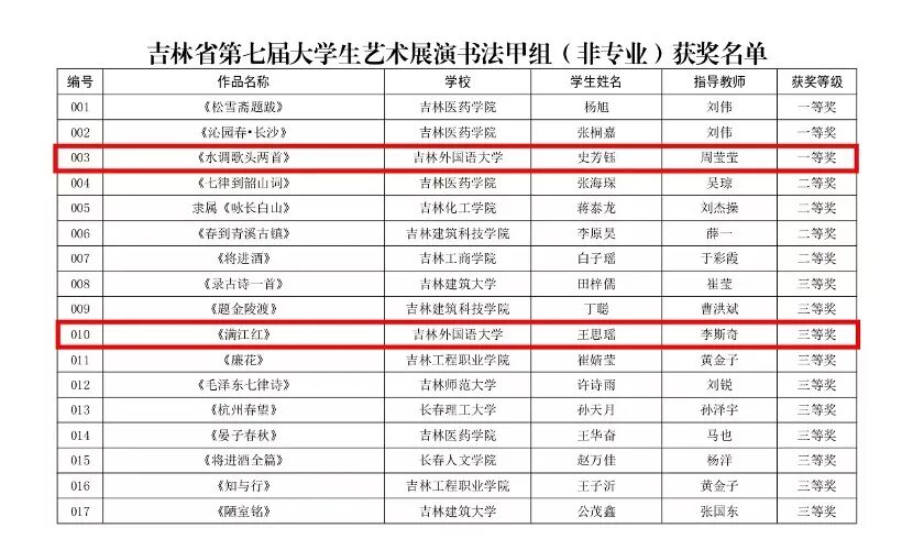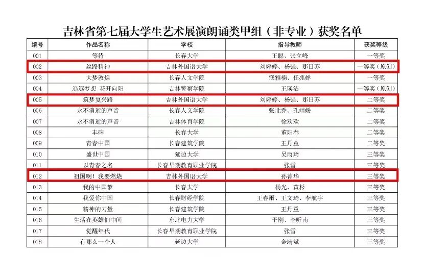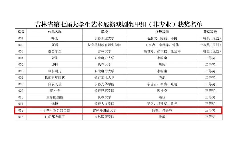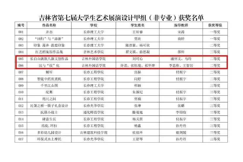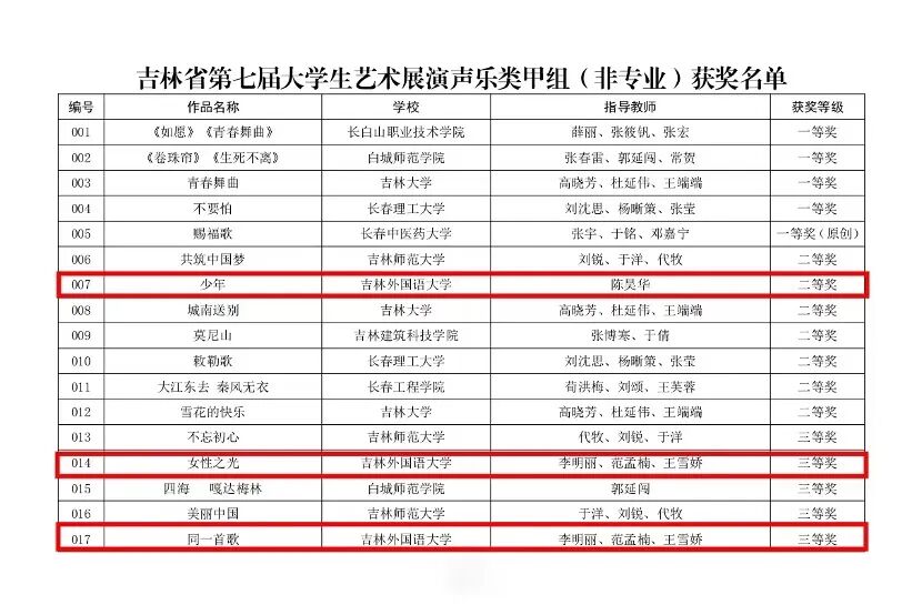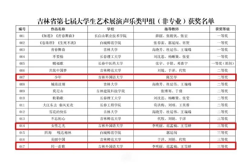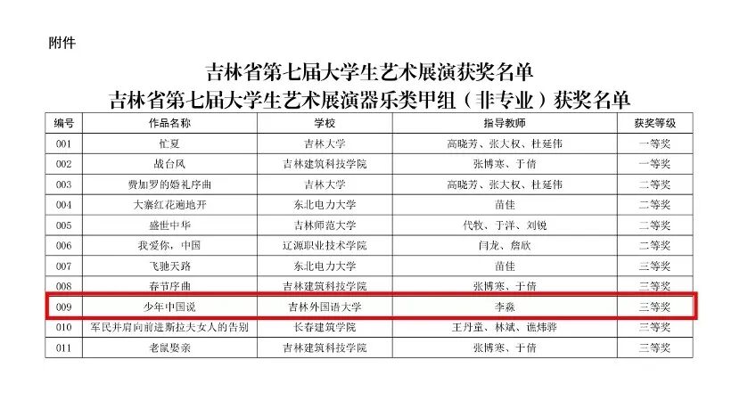 近日,由省教育厅组织的吉林省第七届大学生艺术展演获奖名单公布。经专家评审、专场演出、汇报展演(展示)等环节,我校共获奖15项,其中一等奖2项、二等奖4项、三等奖9项。此外,我校还凭借出色的组织工作荣获“优秀组织奖”。