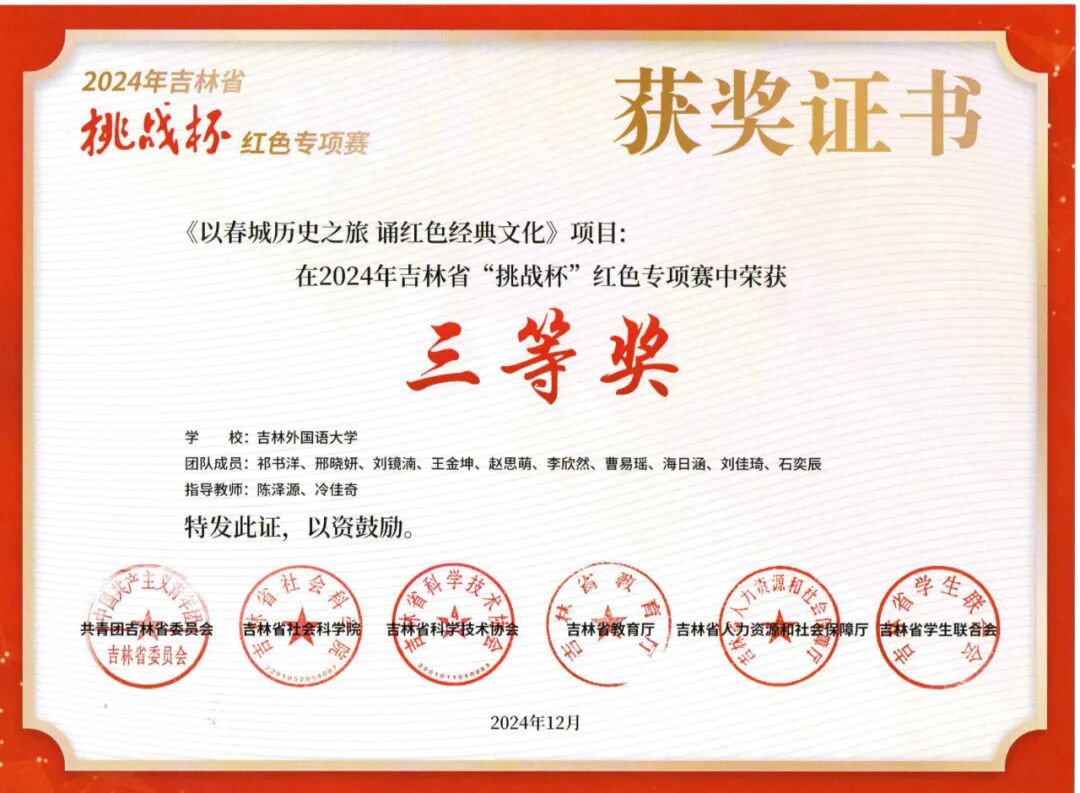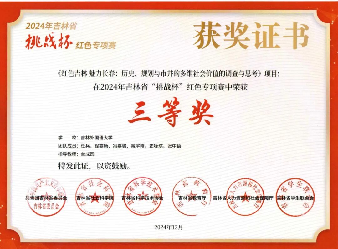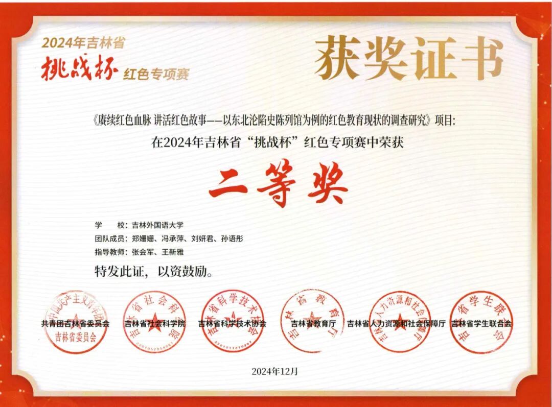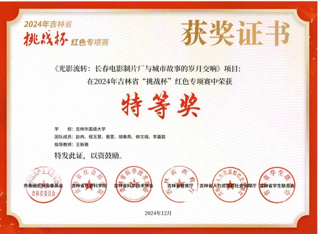 近日, 2024年吉林省“挑战杯”红色专项赛圆满落幕,由共青团吉林省委员会、吉林省社会科学院、吉林省科学技术协会、吉林省教育厅、吉林省人力资源和社会保障厅、吉林省学生联合会联合开展的2024年吉林省“挑战杯“红色专项赛评选结果公布。我校11项作品获奖,其中《光影流转:长春电影制片厂与城市故事的岁月交响》荣获特等奖,《红装白马傲骨香,英雄精神促吉兴——抗日英烈赵一曼的事迹追溯及其精神价值对吉林省振兴发展的促进作用分析》荣获一等奖,《“重走抗联路,葱岭枫愈浓”敦化市寒葱岭红色教育基地的调查研究》等3个项目荣获二等奖,《东北沦陷史陈列馆红色文化传播的调查研究》等6个项目荣获三等奖,获奖质量、数量创历史新高。