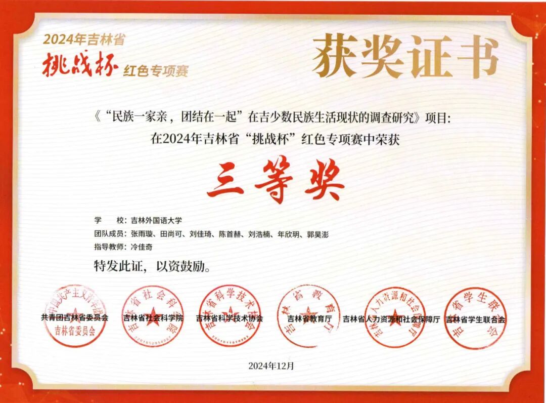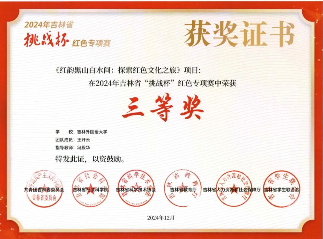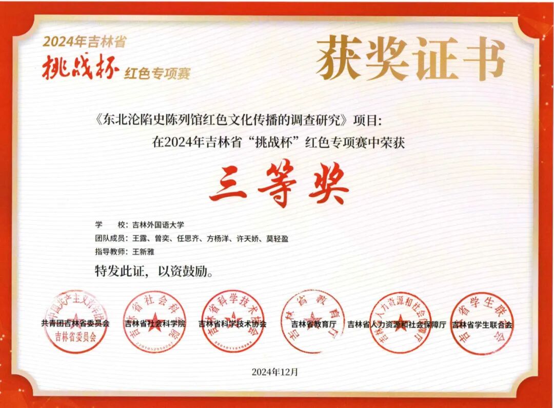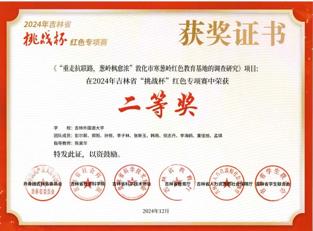 近日, 2024年吉林省“挑战杯”红色专项赛圆满落幕,由共青团吉林省委员会、吉林省社会科学院、吉林省科学技术协会、吉林省教育厅、吉林省人力资源和社会保障厅、吉林省学生联合会联合开展的2024年吉林省“挑战杯“红色专项赛评选结果公布。我校11项作品获奖,其中《光影流转:长春电影制片厂与城市故事的岁月交响》荣获特等奖,《红装白马傲骨香,英雄精神促吉兴——抗日英烈赵一曼的事迹追溯及其精神价值对吉林省振兴发展的促进作用分析》荣获一等奖,《“重走抗联路,葱岭枫愈浓”敦化市寒葱岭红色教育基地的调查研究》等3个项目荣获二等奖,《东北沦陷史陈列馆红色文化传播的调查研究》等6个项目荣获三等奖,获奖质量、数量创历史新高。