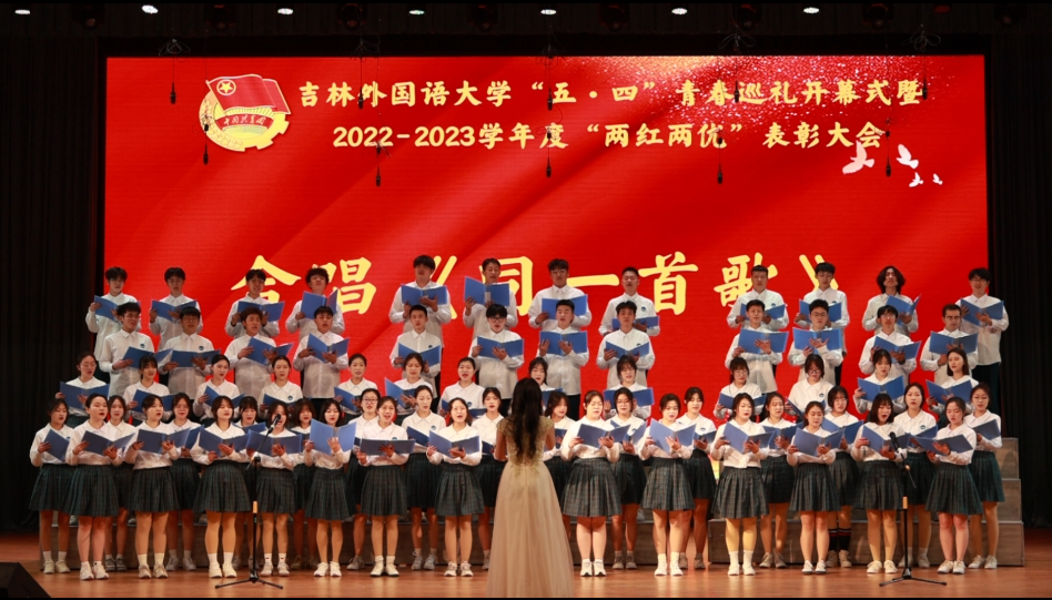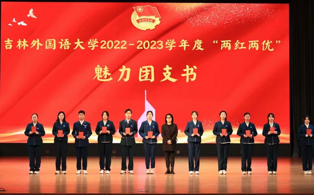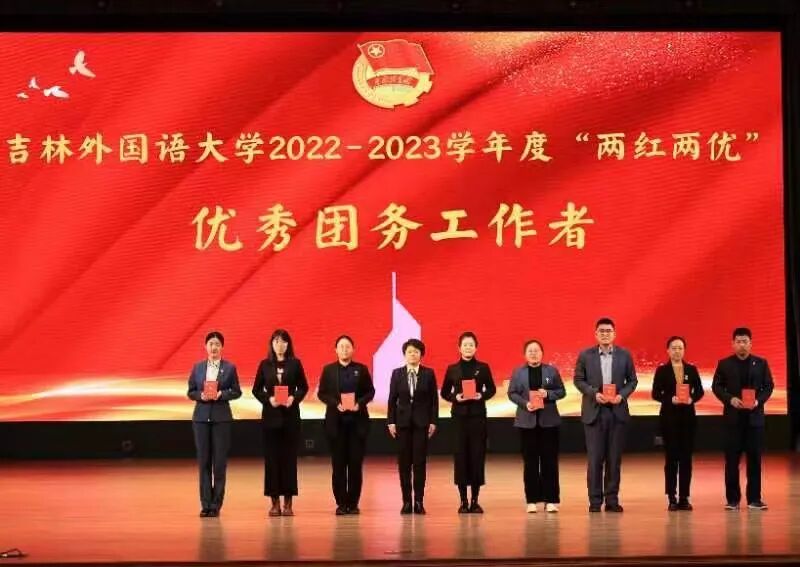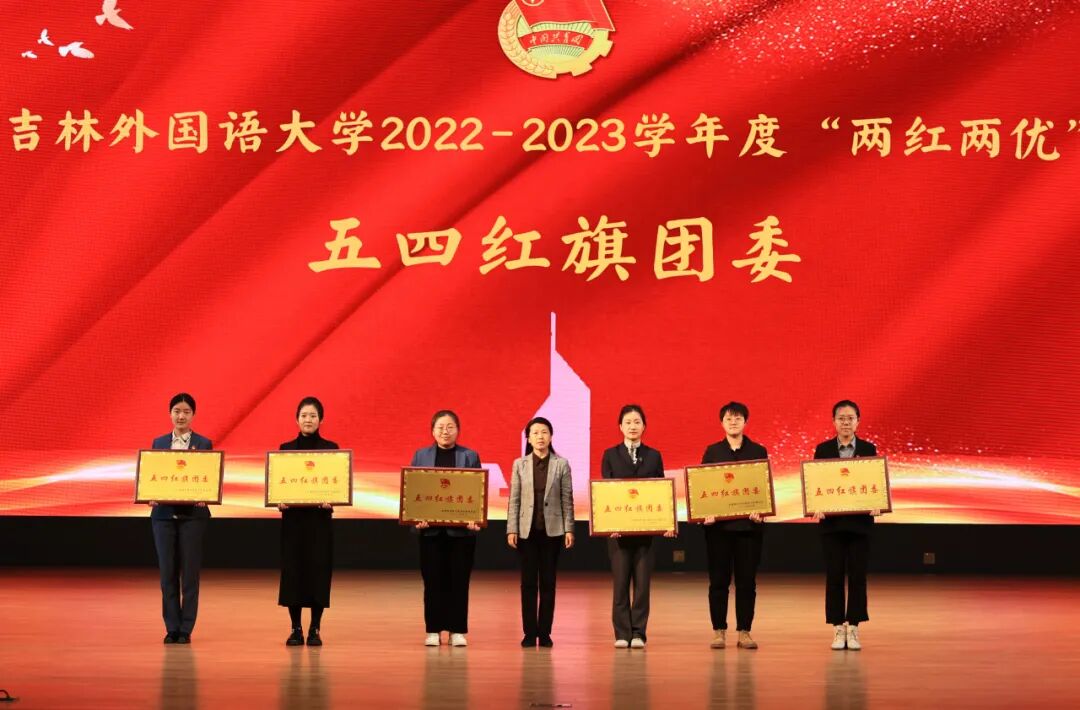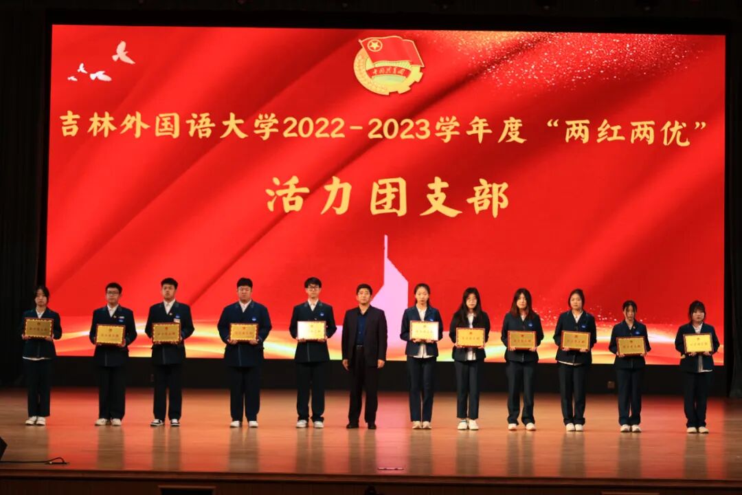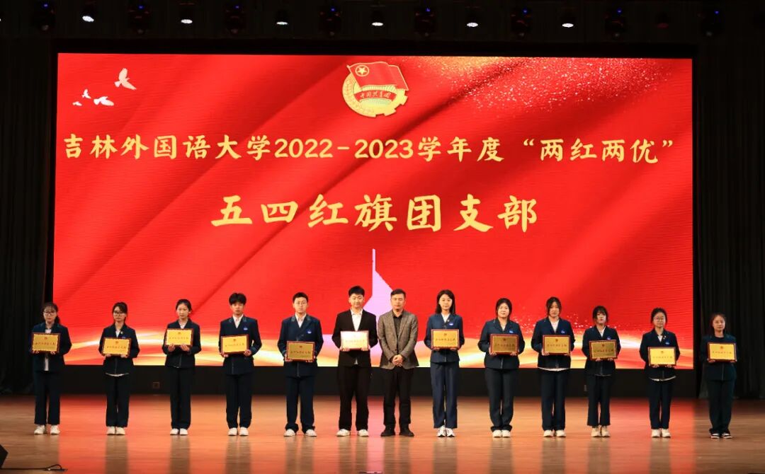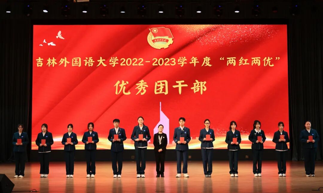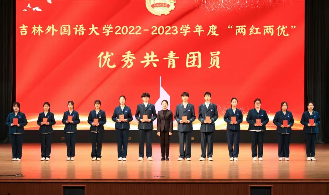 校团委副书记李明丽宣读了《关于吉林外国语大学2022-2023学年两红两优评选的表彰决定》,与会领导向收到表彰的先进集体合个人代表颁发了奖牌和证书。