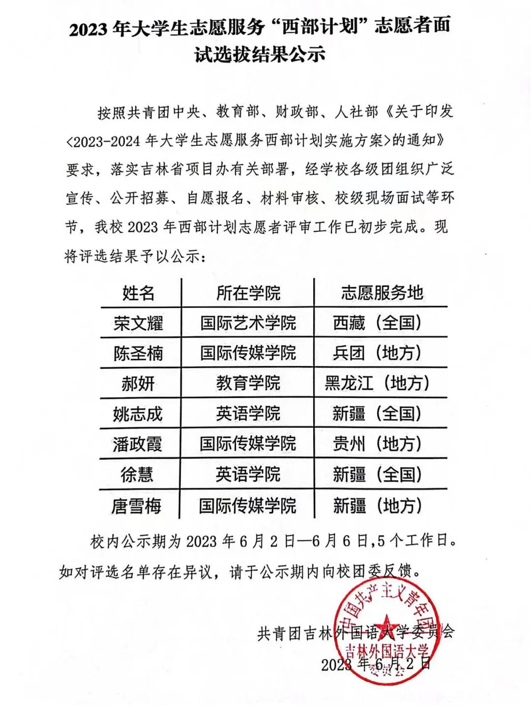 我校自开展“西部计划”推荐选拔工作以来,先后有五十余名毕业生投身西部建设,志愿者遍布新疆、西藏等多个服务地。他们满怀着吉外公益精神,真正实现了“到西部去、到基层去、到祖国最需要的地方去”,为当地的脱贫攻坚、乡村振兴和现代化建设发展贡献了青春力量,在西部基层火热的实践中淬炼成长、建功立业,为党、为祖国、为人民多作贡献,成长为有理想、敢担当、能吃苦、肯奋斗的新时代好青年。今后,校团委将持续大力宣传“西部计划”,做好相关培养、选拔推荐工作,让青春之花绽放在祖国最需要的地方!
