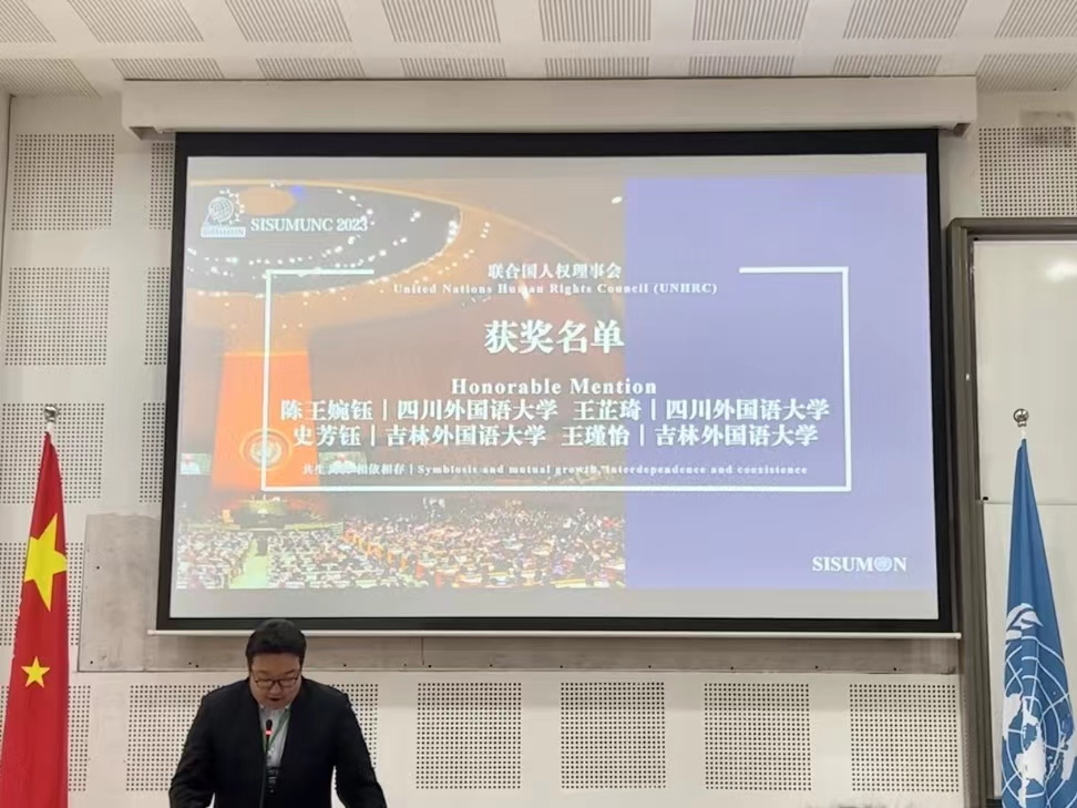 2023年6月9日至6月11日,由四川外国语大学国际关系学院举办的2023年四川外国语大学模拟联合国大会在重庆召开。我校模拟联合国协会4名同学参加会议,并凭借出色表现,取得优异成绩。