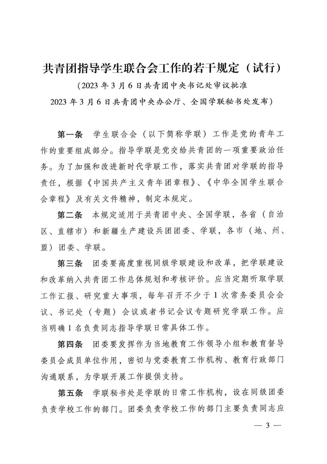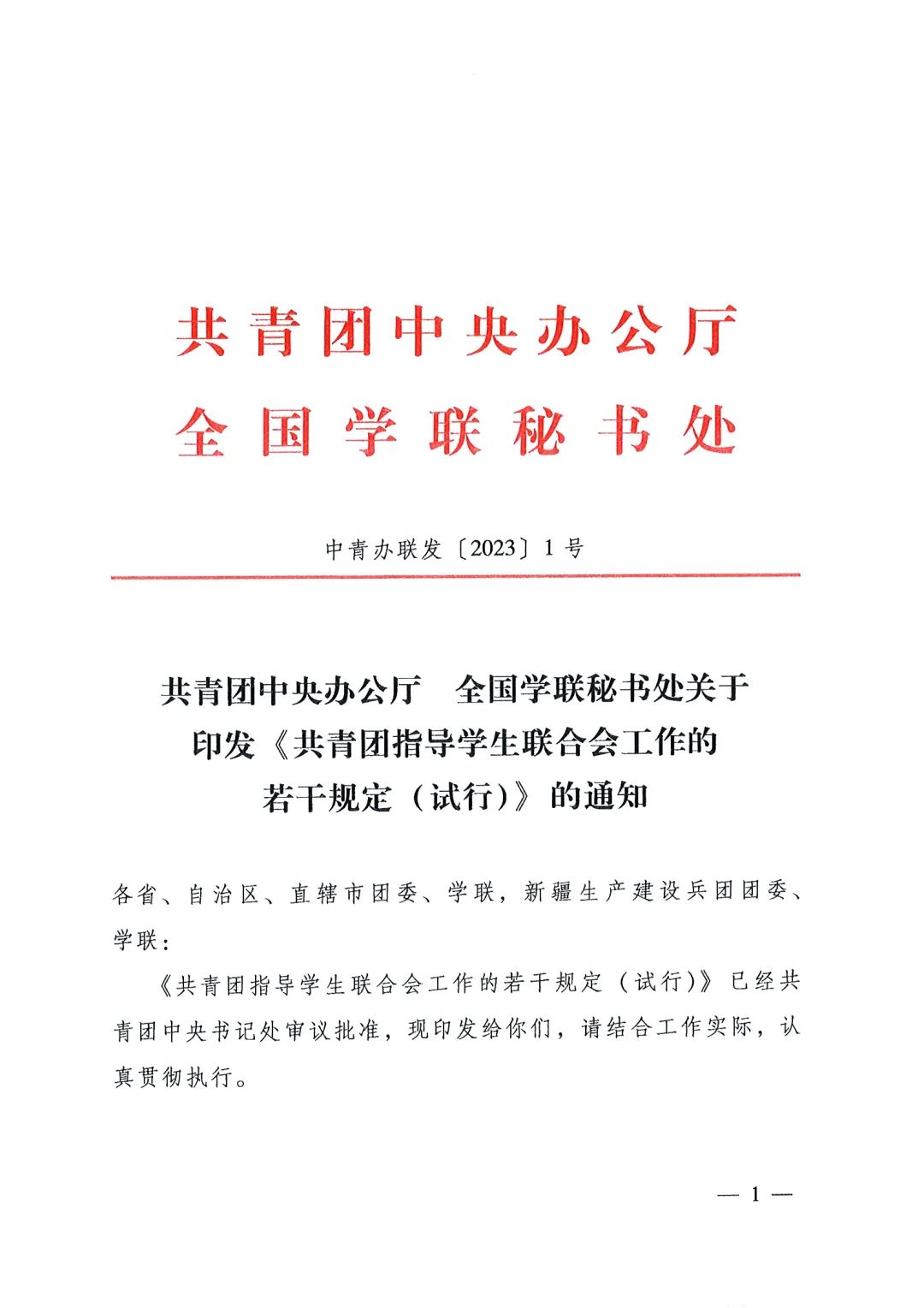 近日,经共青团中央书记处审议批准,团中央办公厅和全国学联秘书处联合印发《共青团指导学生联合会工作的若干规定(试行)》。
