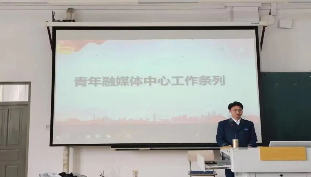 校融媒体中心技术部部长曹进洋同学宣读青年融媒体中心工作条例。各组织成员认真聆听,积极学习与反馈。