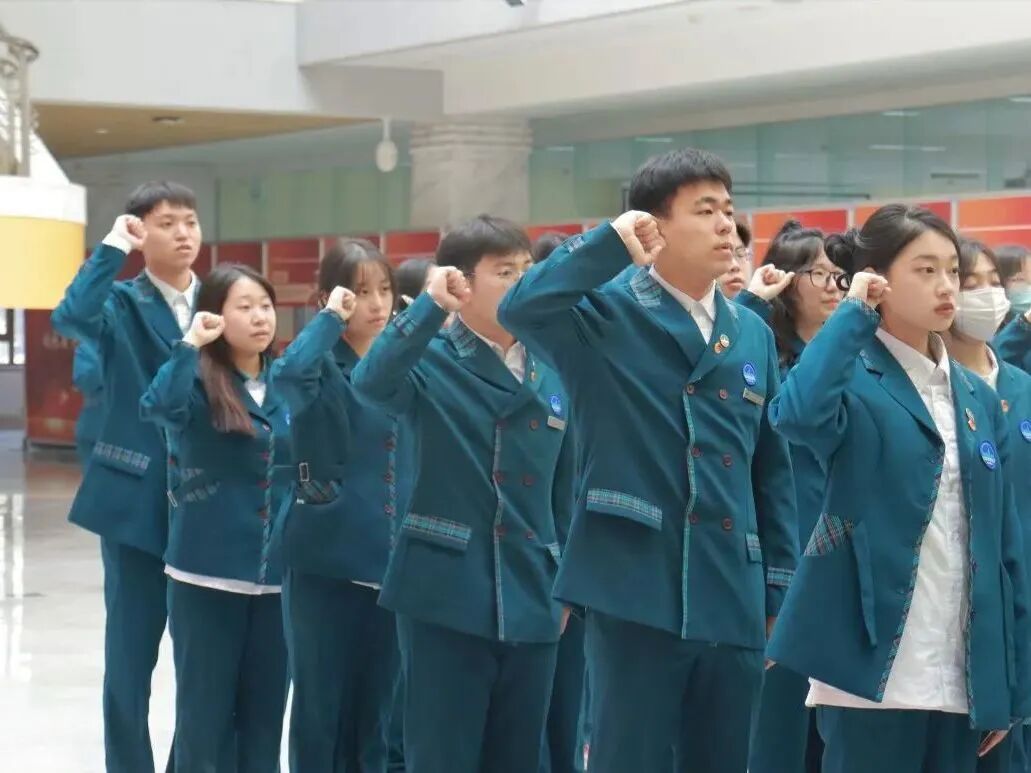 在领誓员的带领下,同学们重温庄严的入团仪式,团员们高举右拳,在鲜艳的团旗下庄严宣读入团誓词,铿锵有力的誓词回荡在现场每一位同学心中。通过重温入团誓词,团员们明确了共青团员的责任与义务,坚定理想信念,深刻认识到自身肩负的历史使命和担当。他们纷纷表示,将在今后的学习生活中,不忘初心,牢记使命,以实际行动践行入团誓词,切实为班级、学院、学校争光,为团徽添彩。