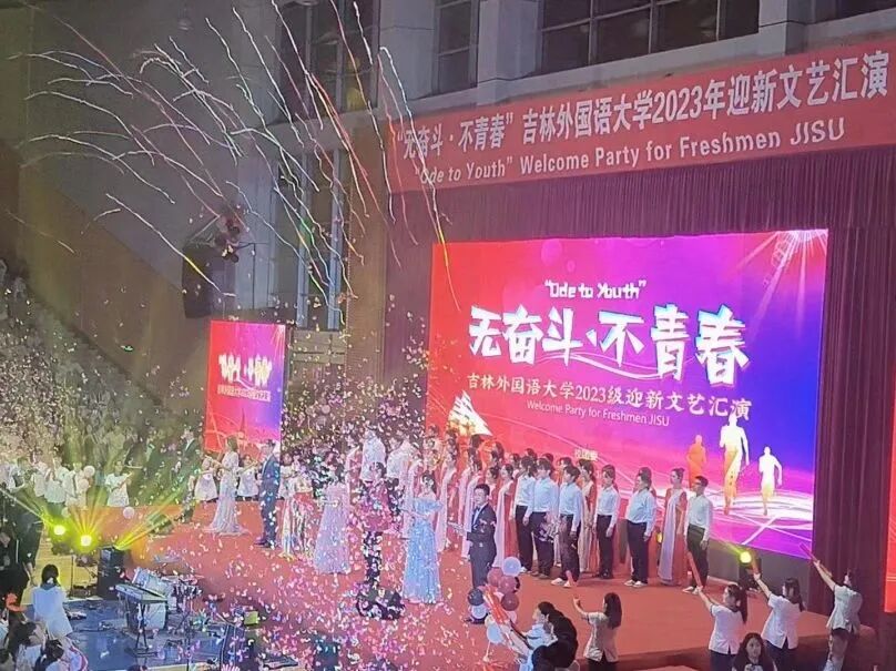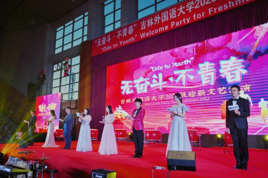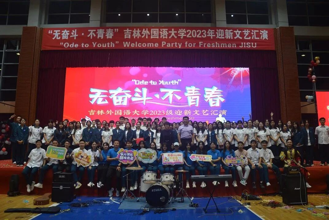 9月14日18:00,“无奋斗·不青春”吉林外国语大学2023年迎新文艺晚会在学校体育馆2楼举行。学校校党委副书记苗晶,学生处、校团委等相关部门负责人、各学院学工办主任、团委书记和全体辅导员老师,演职人员以及2023级全体新生共计4000余人,共同观看了本次文艺汇演。晚会由校团委主办,各学院协办,整场晚会分为“家国情怀显担当、世界文明齐共鉴、青春逐梦向未来”三个篇章。展现了吉外“会通中外、砺志敦材”的精神,鼓舞着所有新生勤学苦练,并对新生们寄予厚望,希望他们在吉外能够开启他们人生的新篇章。