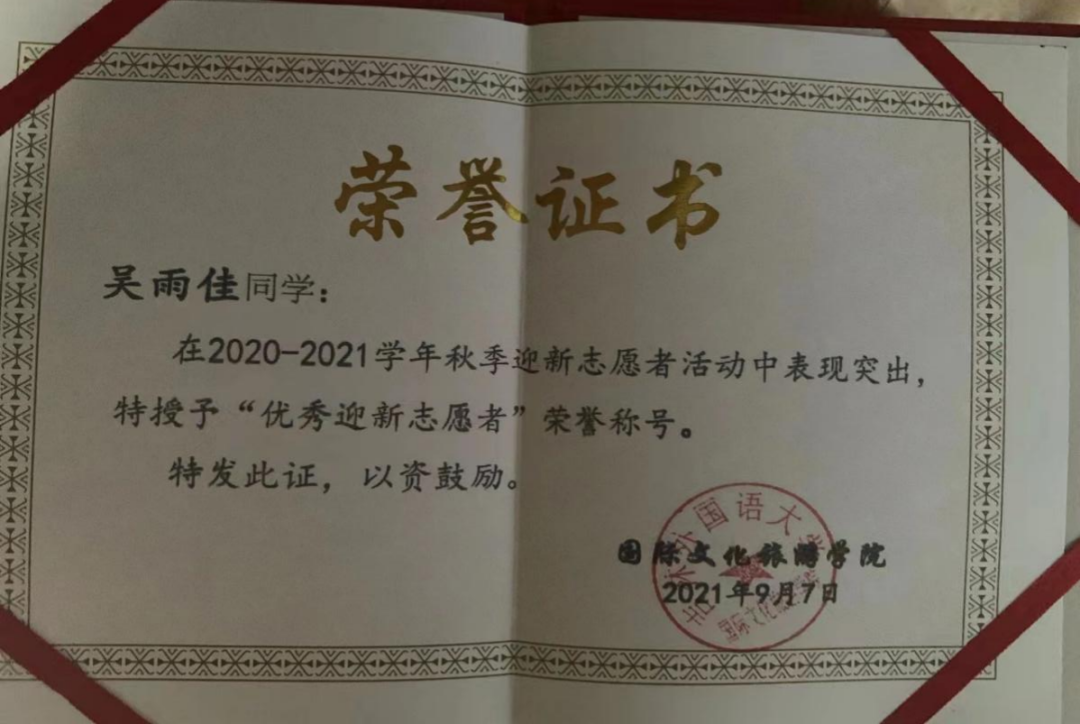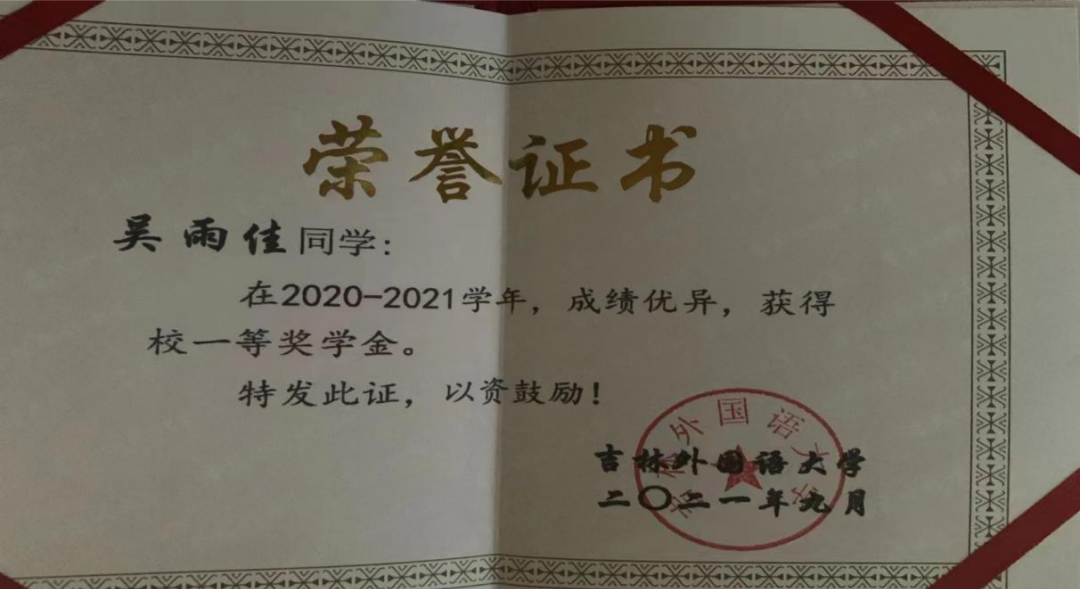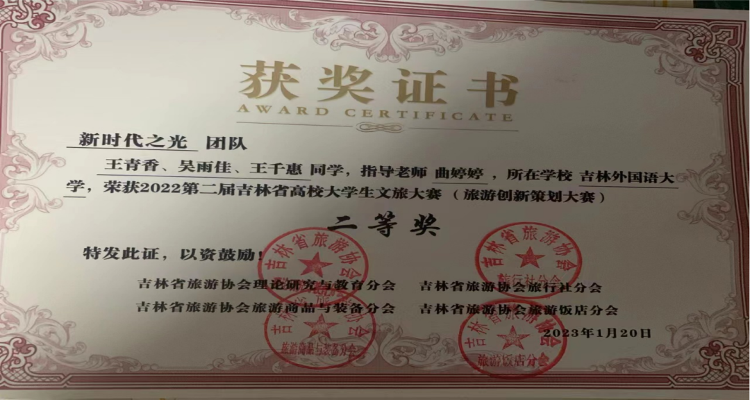 从入学以来,对学习从未松懈,认真学好专业知识,学习成绩良好,曾荣获校一等奖学金、校二等奖学金、校三好学生、优秀团干等荣誉称号。也参与一些学院学校或省级组织的比赛或活动,获得过第二届吉林省高校大学生文旅大赛二等奖、第十二届全国大学生红色旅游创意策划大赛二等奖、第三届吉林省高校冰雪创意大赛三等奖。