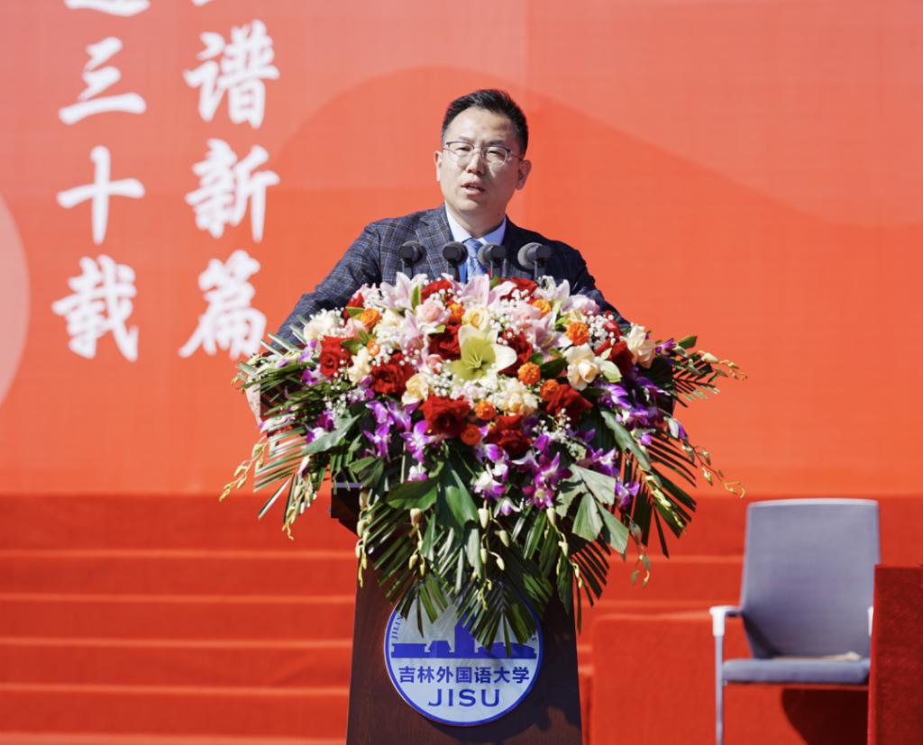 贾晓东发表致辞。他指出,吉林外国语大学是全国民办高校的榜样和标杆,也是吉林省地方高等教育发展的品牌和骄傲。希望学校站在建校30周年的新起点,继续发扬“敢为人先,追求卓越”的精神,奋力书写高质量发展的时代答卷。继续坚持立德树人的办学方向,更好地担负起教书育人的政治责任;坚持以追求卓越精神办好学校,持续为我省高等教育事业高质量发展贡献力量;坚持以脚踏实地的精神办好学校,加快建成国内领先、国际知名的高水平应用型外国语大学,为推进国家“一带一路”倡议、东北亚开发开放和吉林全面振兴率先实现新突破提供有力的人才和智力支撑。