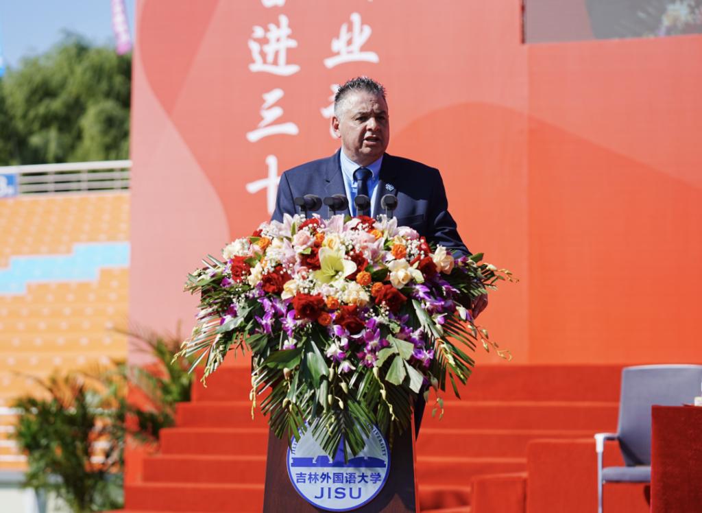 美国圣彼得大学校长胡伯特·贝尼特斯发表致辞。他表示,吉林外国语大学始终坚守“以学生为中心,办最负责任教育”的承诺,充分满足学生的学习需求和职业发展,赋予学生开阔的国际视野和拥抱世界的思维与技能。吉外学生在学科竞赛中屡创佳绩,不仅是学校卓越教育质量的体现,更是学生专业能力提升和全面发展的有力证明。圣彼得大学与吉外在以学生为中心、以全球为导向、以高质量教育为目标的价值理念上高度一致。两校将在美国新泽西州共建中文教师教育中心,通过跨文化、跨院校的合作,共同培养服务世界、引领未来的卓越人才,惠及世世代代。