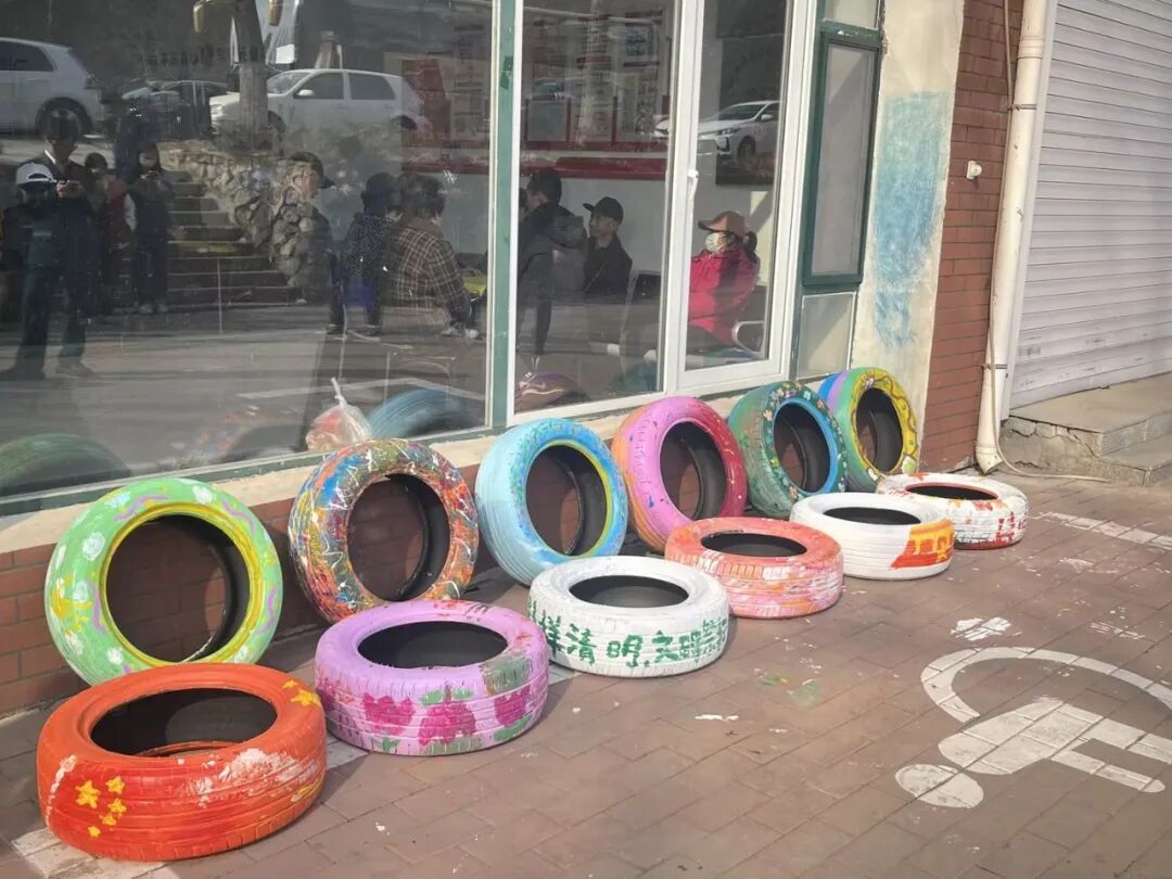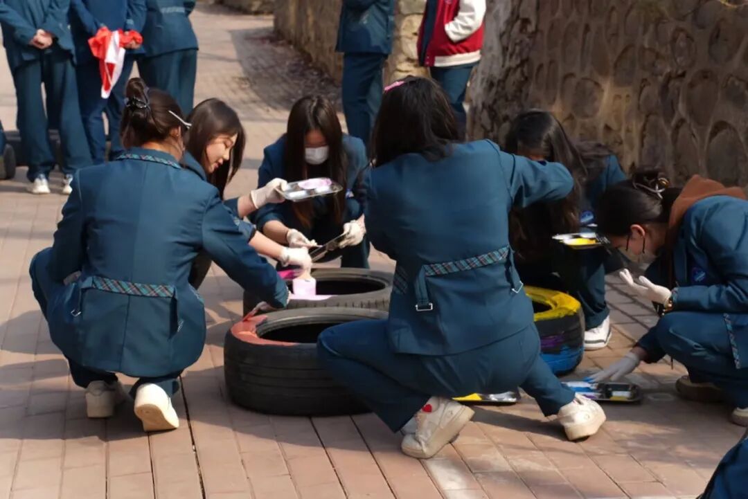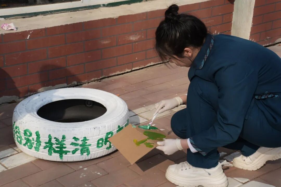 随后,全体同学与居民们一起进行绘制轮胎,以绘画方式宣扬“清明文明祭扫,铭记革命精神”。