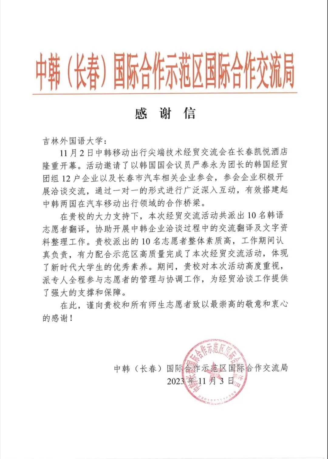 吉林外国语大学东方语学院10名朝鲜语专业翻译志愿者为此次大会提供了会议翻译志愿服务。吉林外国语大学历来重视学生综合实践能力的培养,学校更是秉持“在吉外,人人都是志愿者”的志愿服务教育理念,现已在全校范围内形成了浓厚的志愿服务氛围。