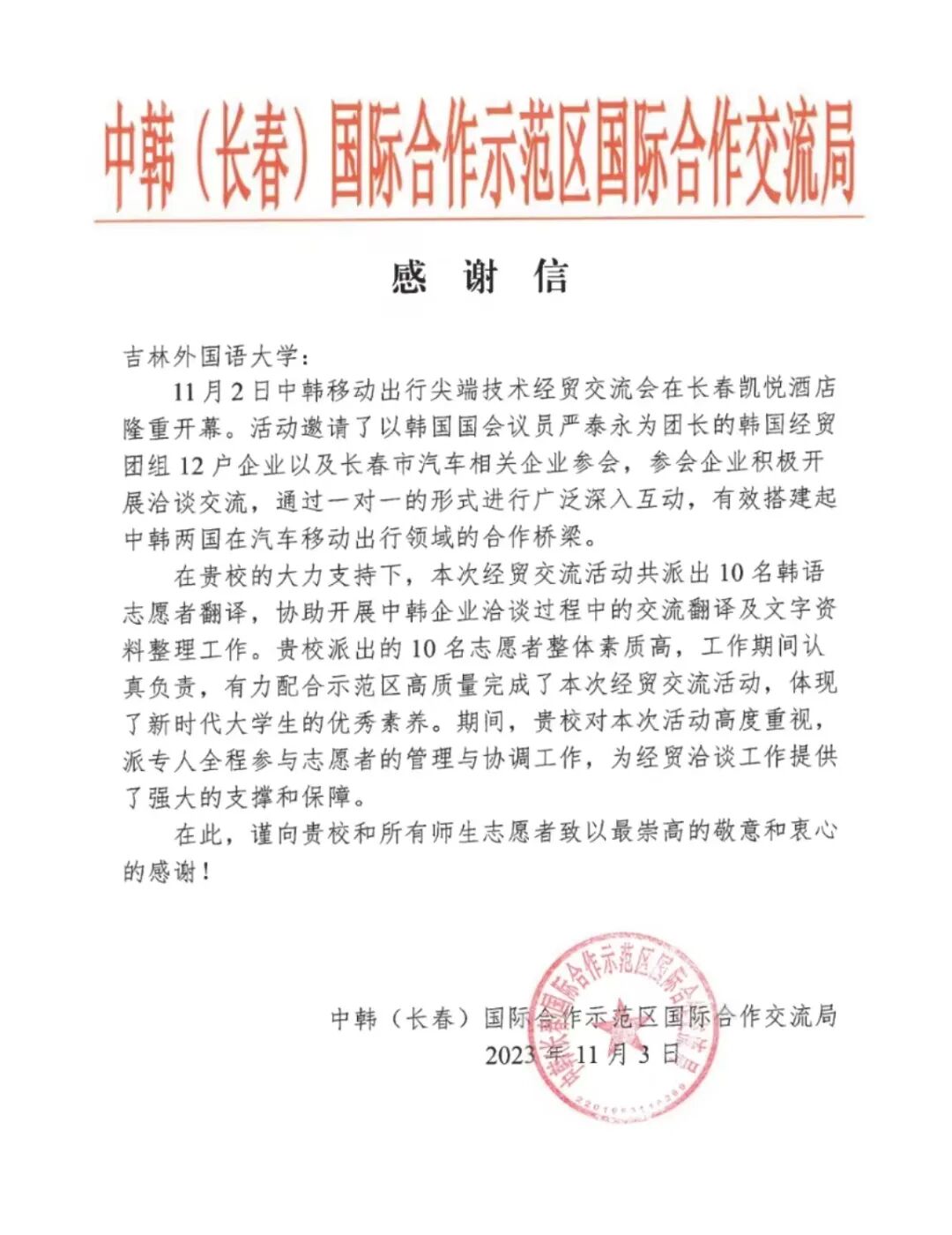 会议期间,志愿者们用良好的职业道德、踏实的工作作风,较好的职业水准,践行着我校校训,提升学校社会影响力和美誉度,得到了中韩(长春)国际合作示范区国际合作交流局和活动主办方的高度肯定和衷心的感谢。