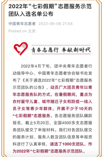 6月,团中央青年志愿者行动指导中心、中国青年志愿者协会秘书处面向全国遴选1000支“七彩假期”志愿服务示范团队,我校译言益行志愿服务队成功入选。
