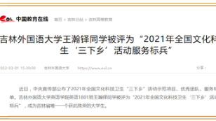 3月6日,我校英语学院英语1801班王瀚铎同学被评为“2021年全国文化科技卫生‘三下乡’活动服务标兵”,成为吉林省唯一一个获此殊荣的大学生。此次获奖,充分展示了学校的育人成果和吉外志愿者的青春风貌,为进一步提高学校志愿服务工作水平,切实发挥“实践育人”成效,激发广大学生积极投身志愿服务工作,创造了有利条件。