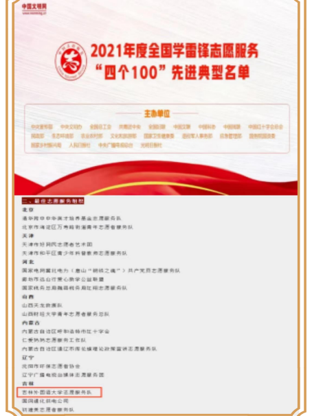 5月30日,中央宣传部、中央文明办等部门和单位在全国范围内开展2021年度全国学雷锋志愿服务“四个100”先进典型推选活动公布获奖名单。我校志愿服务队被评为“最佳志愿服务组织”,是吉林省入选的10个先进典型之一,也是吉林外国语大学再次入选中宣部全国学雷锋志愿服务“四个100”先进典型。此次获奖对于培养志愿服务精神,深化志愿服务项目内涵,强化“实践育人”人才培养理念,具有重要意义。