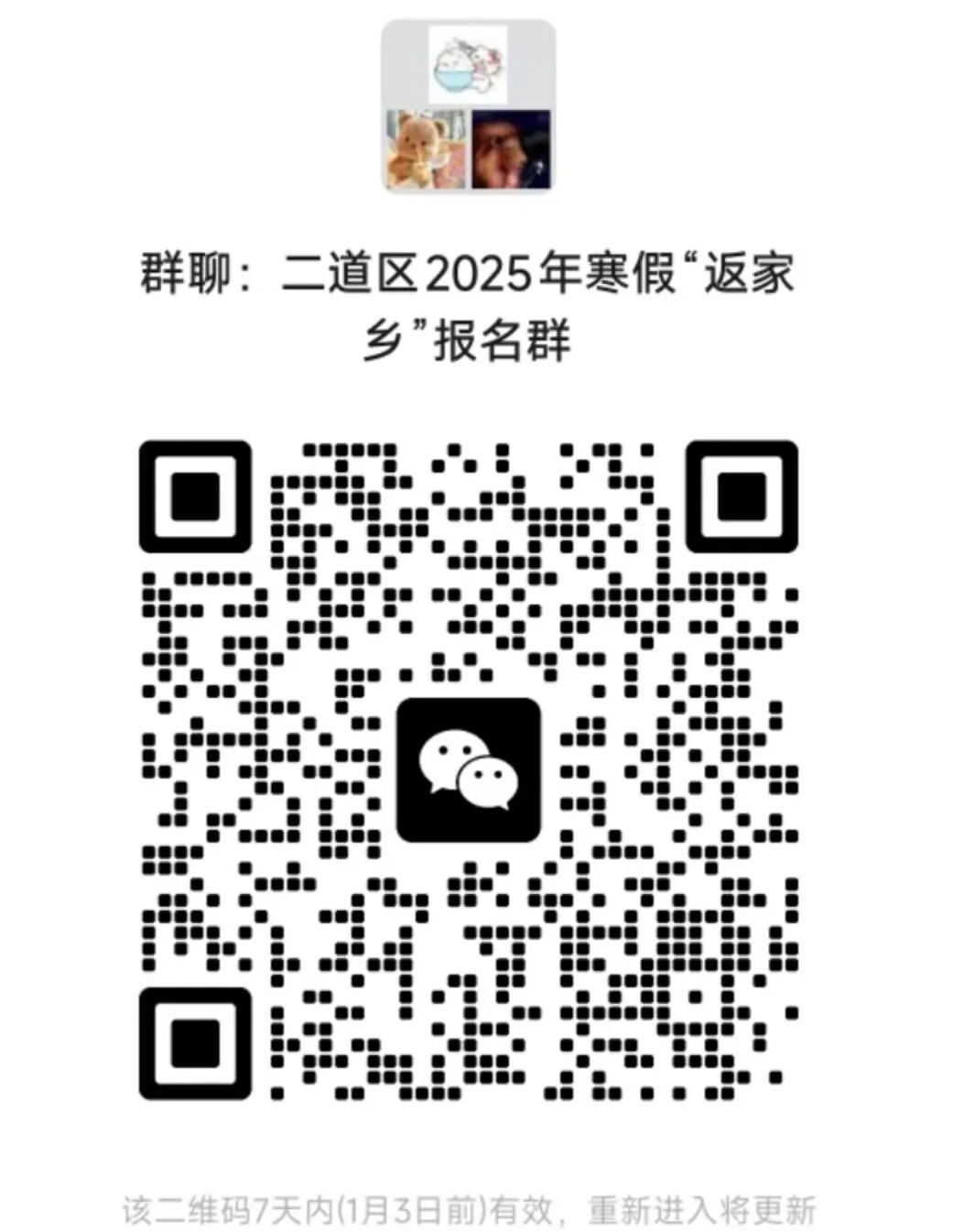 4.为保证后续沟通的高效性,请已报名参加活动的高校学子扫描下方二维码,加入活动专属微信群,并采用实名制以便精准识别与管理。(温馨提示:若微信群二维码显示过期,可关注微信公众号 “长春二道共青团”,发送 “返家乡” 三字,即可获取最新的群二维码信息。)