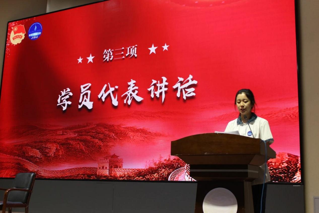 团校学员代表登台发言,表达了对成为共青团员的渴望与决心,号召同学们珍惜学习机会,认真参与培训,在理论学习和实践锻炼中不断提升自我。