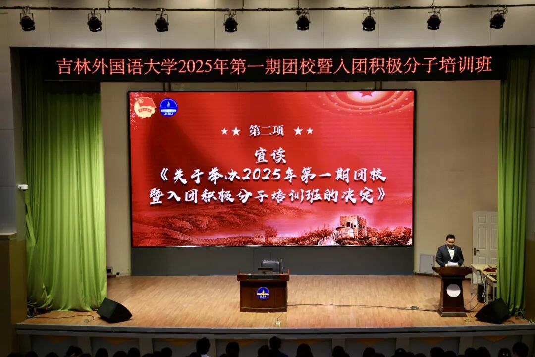 由校团委范孟楠老师宣读《关于举办2025年吉林外国语大学团校暨入团积极分子培训班的决定》,明确了培训的时间安排、课程内容和纪律要求,强调了此次培训的严肃性与重要意义。