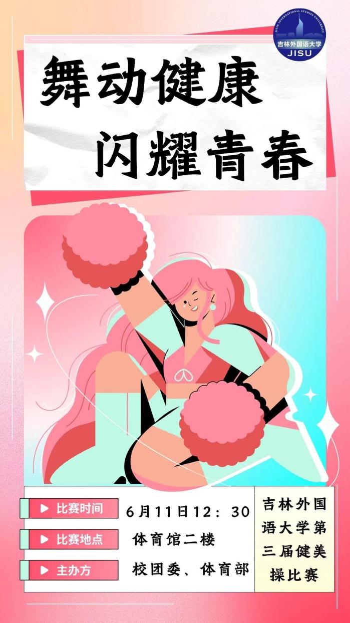 青春是跃动的音符,健康是飞扬的旋律!“舞动健康,闪耀青春”吉林外国语大学第三届健美操比赛将于6月11日12:30 在体育馆二楼 火力全开!这场属于吉外学子的青春盛宴,即将点燃整个校园,邀你共赴一场热血沸腾的活力之约!