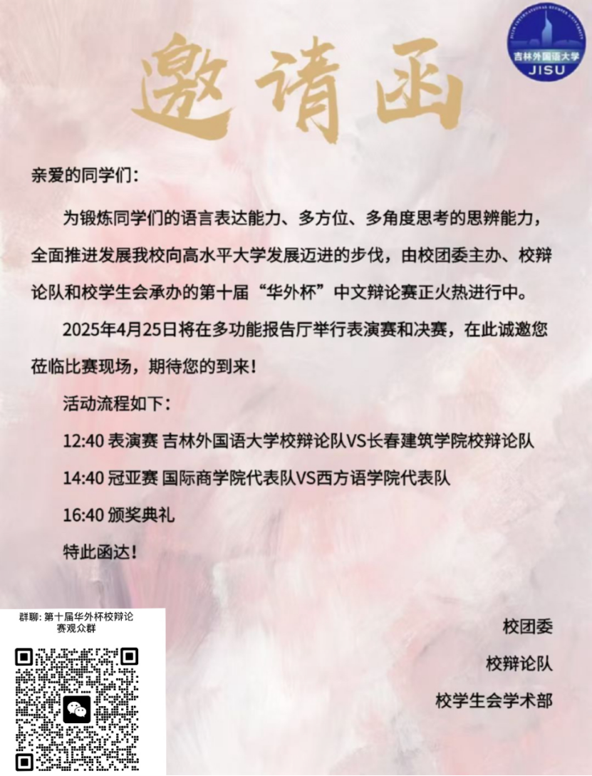 经过层层选拔与激烈角逐,第十届"华外杯"中文辩论赛即将迎来终极之战!4月25日(本周五),多功能报告厅将上演两场精彩赛事: