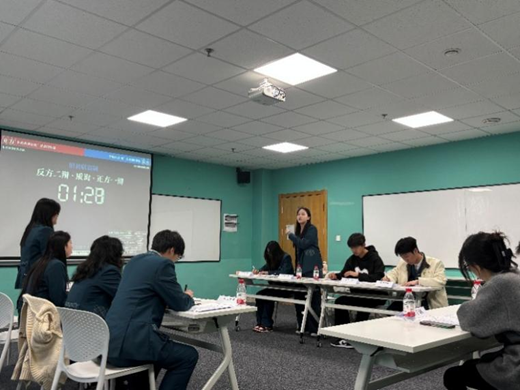 在4月13日第十届“华外杯” 中文辩论赛的半决赛中,各学院代表队围绕“‘幸福者退让论’是善的智慧/对恶的纵容”这一辩题展开激烈辩论。