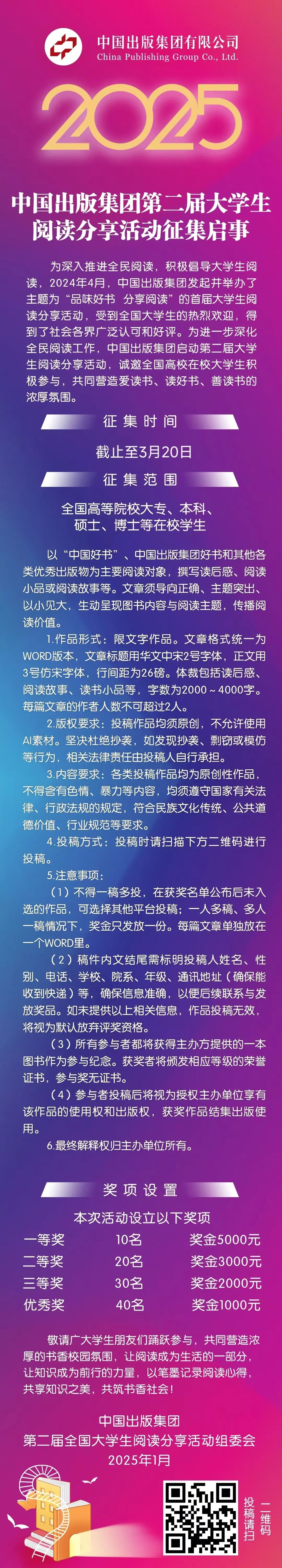 为进一步深化全民阅读工作,中国出版集团于2025年1月正式启动第二届大学生阅读分享活动。现鼓励我省在校大学生积极参与,阅读优秀书籍、传播吉林文化,共同营造“爱读书、读好书、善读书”的校园氛围,推动全民阅读与地域文化传承。