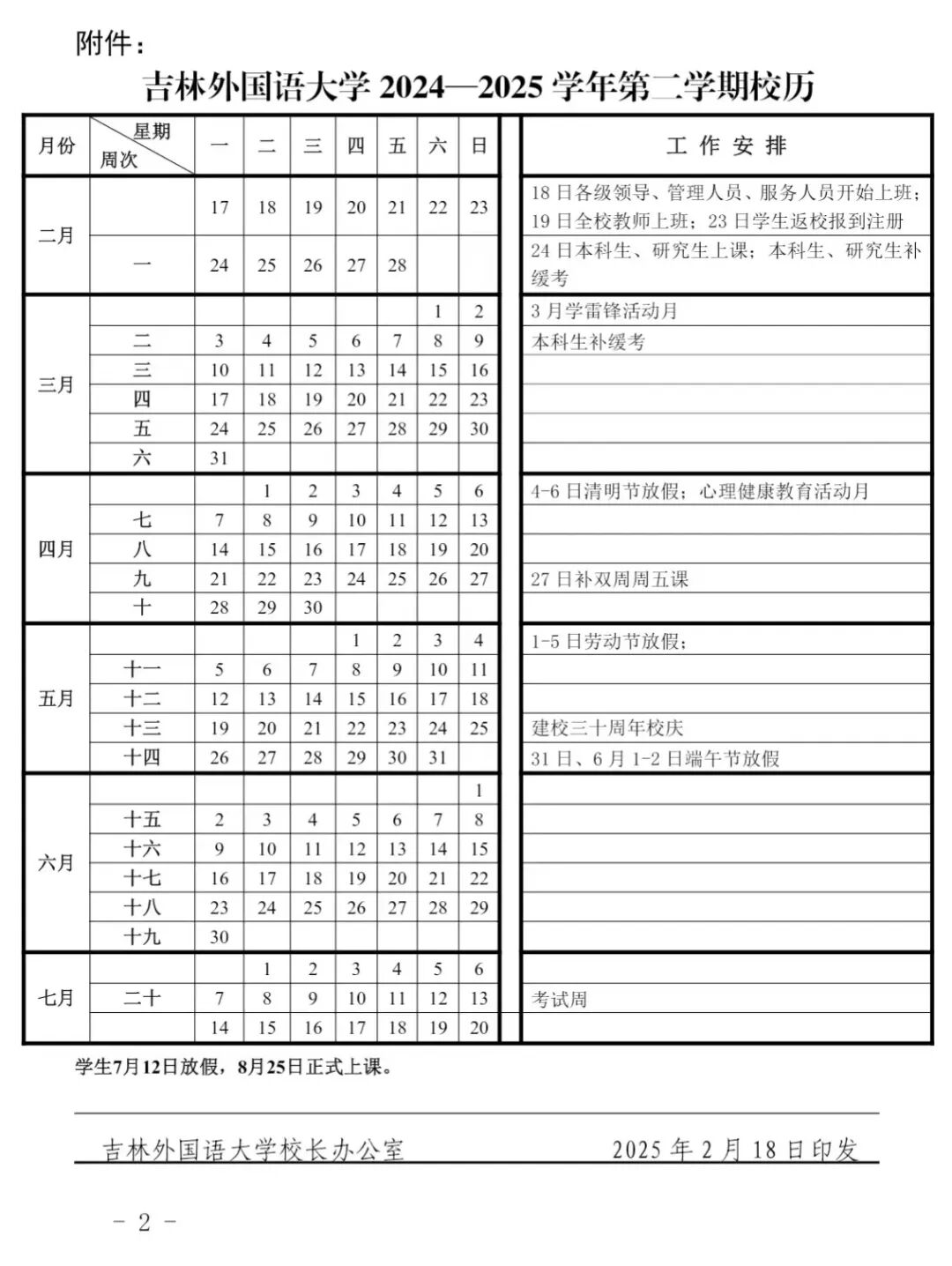 说明:本学期共20周,2025年2月24日正式上课。