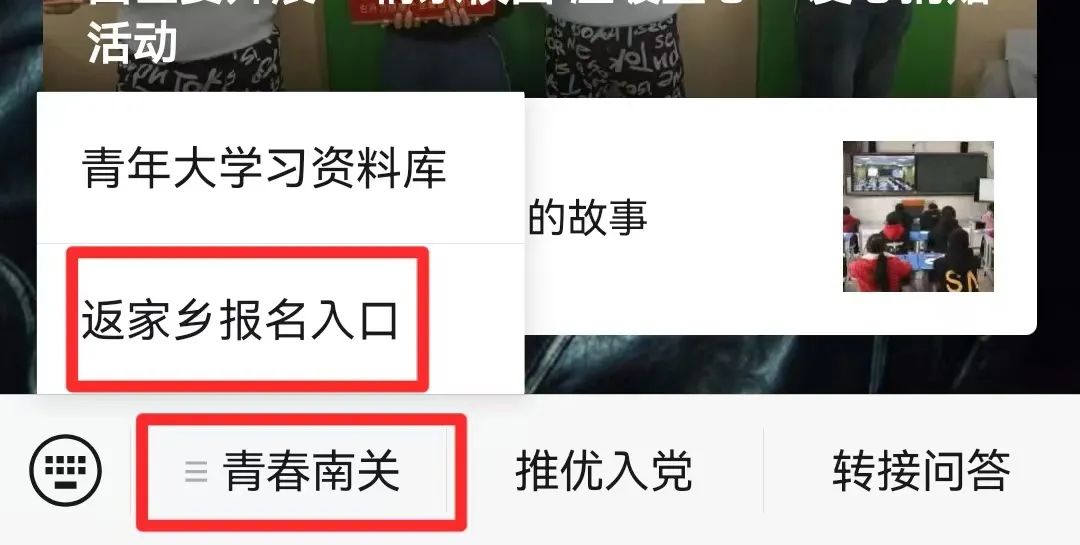 第二步:进入页面,选择青春南关—返家乡报名入口选项