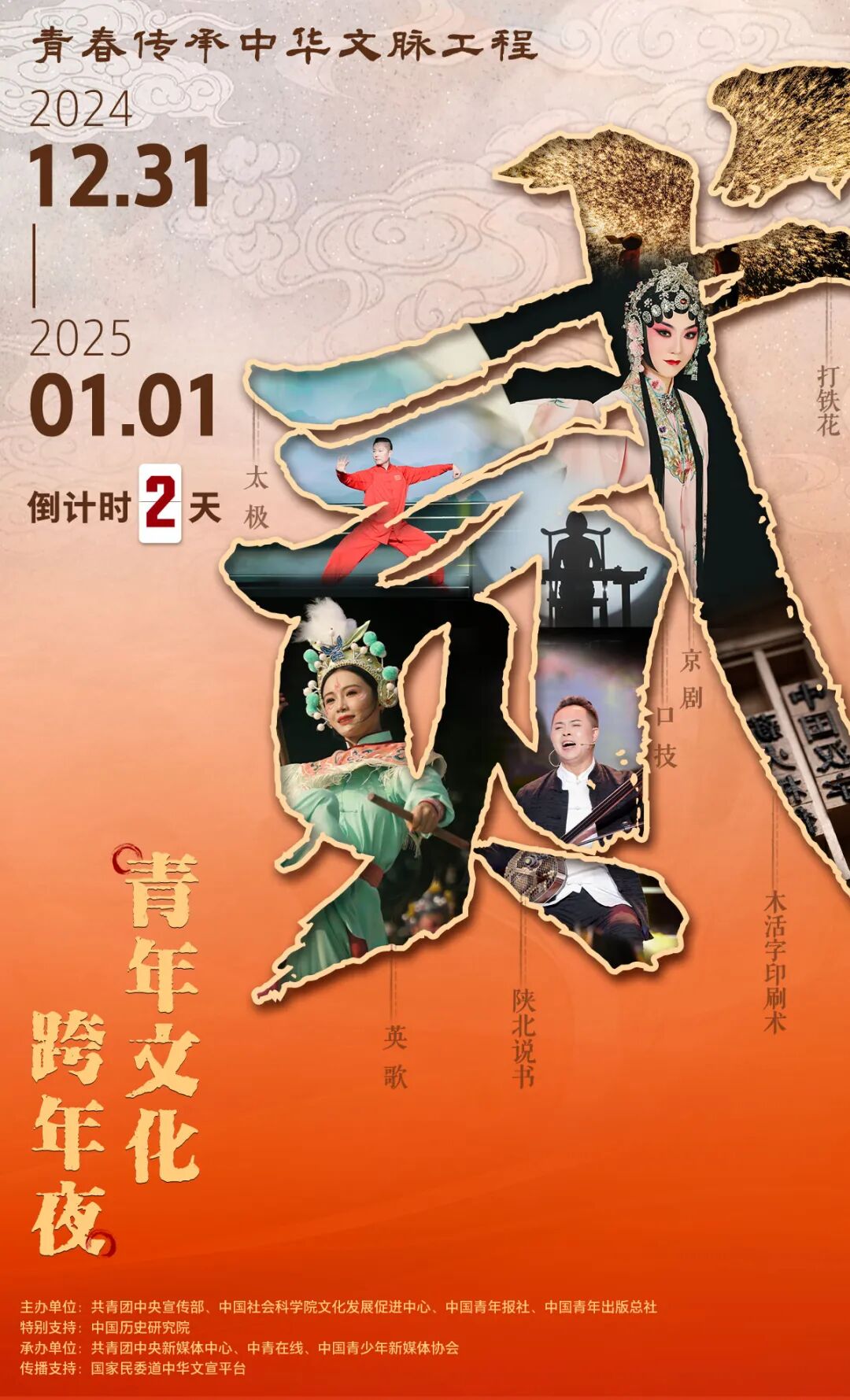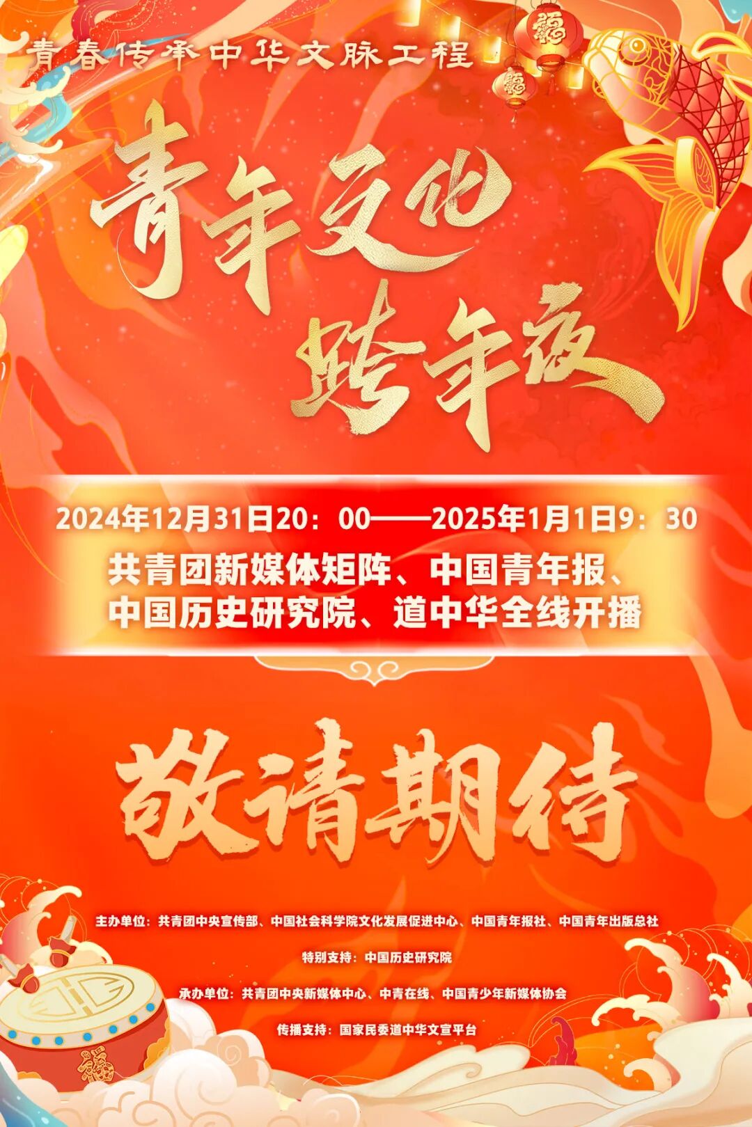 由共青团中央宣传部中国社会科学院文化发展促进中心中国青年报社中国青年出版总社主办中国历史研究院特别支持共青团中央新媒体中心中青在线、中国青少年新媒体协会承办的“青年文化跨年夜”将于2024年12月31日20:00在@共青团中央视频号、微博、抖音、快手、B站及各省级共青团组织视频中国青年报、中国青年网、中国历史研究院、道中华新媒体平台准时开播!