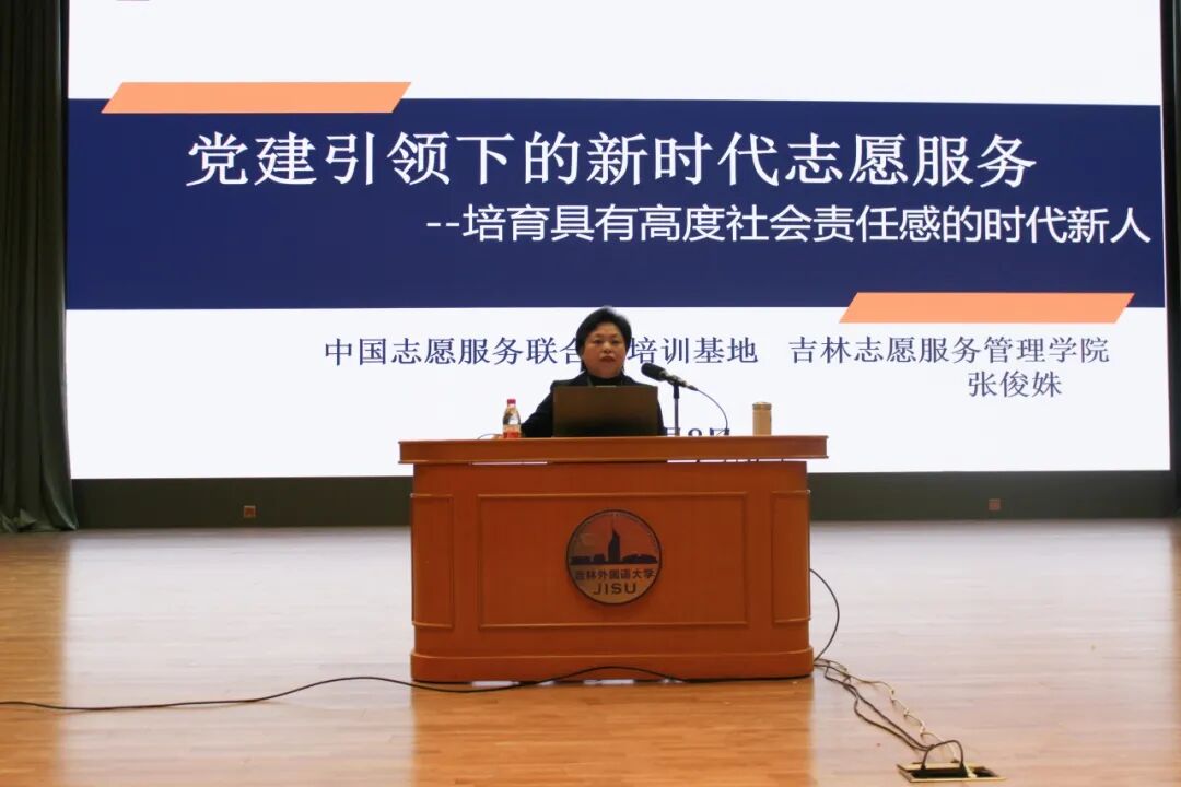 我校创新创业学院院长、吉林志愿服务管理学院院长张俊姝教授以《党建引领下的新时代志愿服务——培育具有高度社会责任感的时代新人》为题,围绕“习近平总书记对志愿服务的高度重视”“党的宗旨与志愿精神的高度契合”“我国志愿服务工作的发展历程”等主题展开讲述。张教授结合鲜活的案例,进行了深入浅出的讲解,充分调动学员积极性,引发热烈互动,现场气氛热烈。