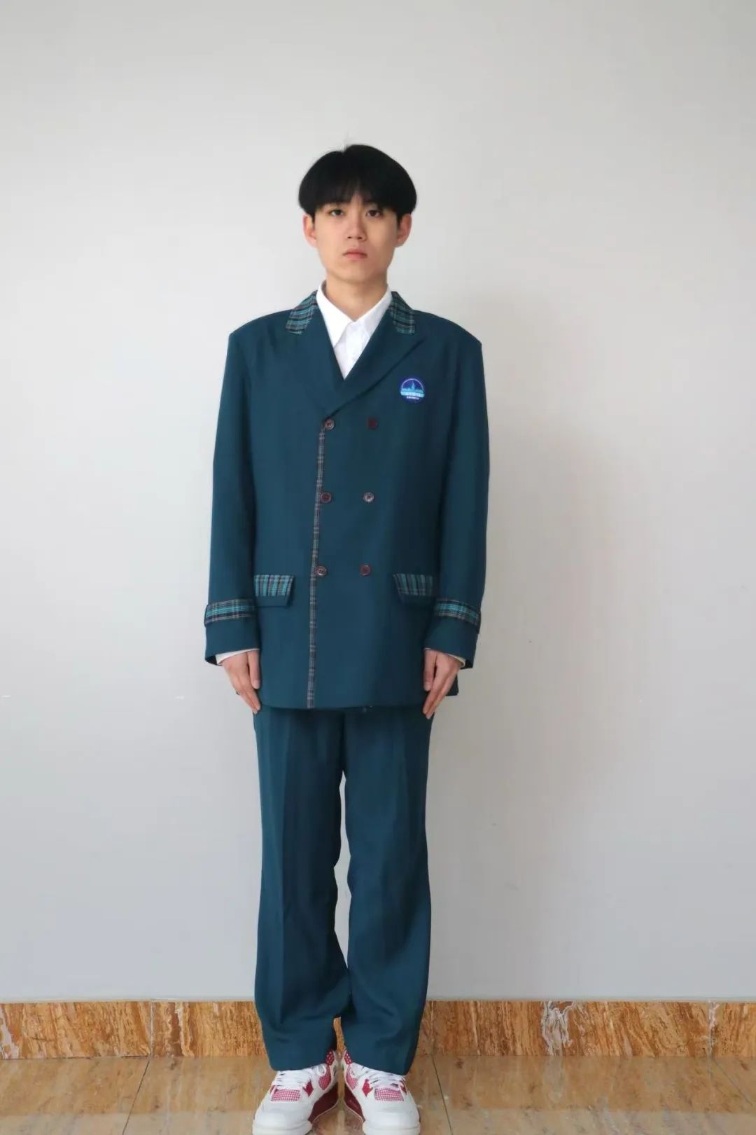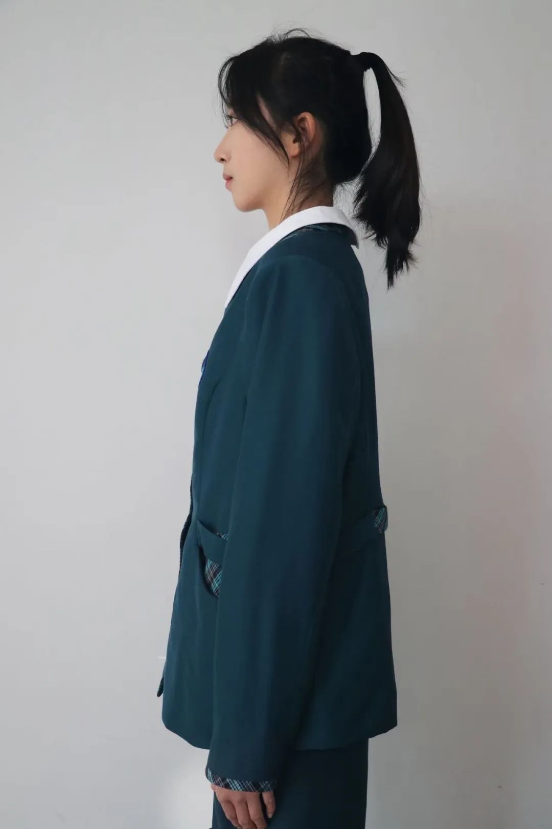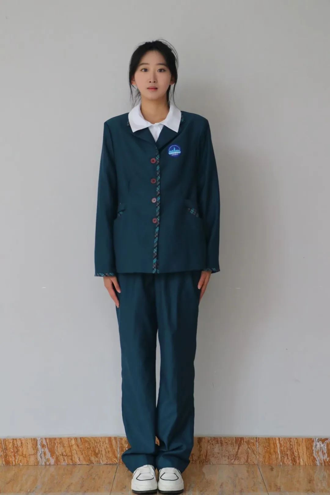 穿长袖衬衫搭配西装校服外套,长裤,衬衫袖口以及领口扣子系好,女生腰间两侧腰带需系紧,衬衫下摆需要扎进裤子里。保持整洁。