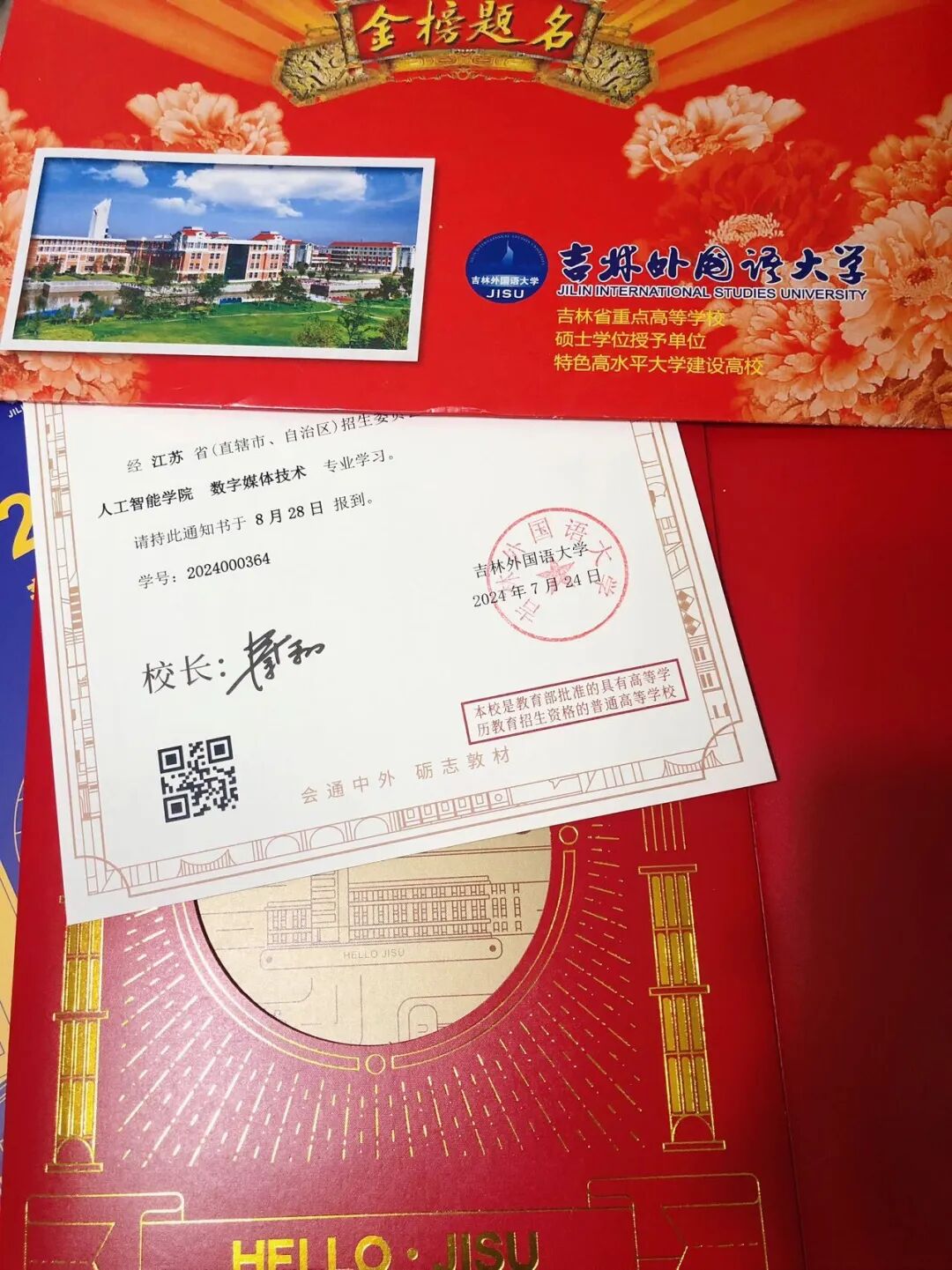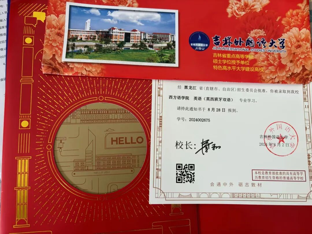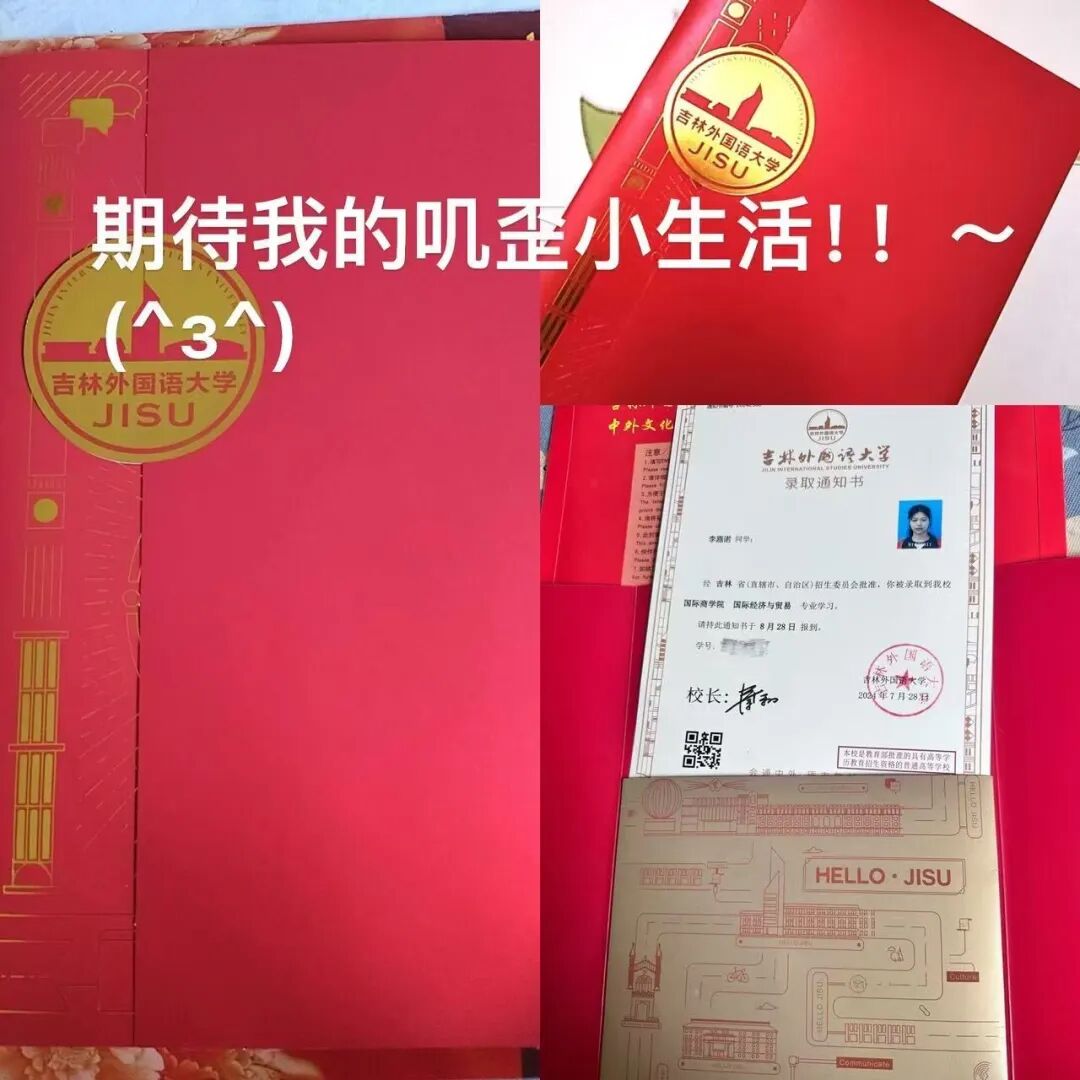 在收到吉林外国语大学的录取通知书时,十二年年熬过的夜终于变成了光,吉林外国语大学不仅是知识的宝库,更是品格的熔炉。在这里,我们会汲取知识的力量,探索世界的奥秘,打开心灵的窗户。正如爱因斯坦曾言:“学校不是生活全部,但却是知识的源泉,是智慧的摇篮。”在这里,我会深入研究自己热爱的领域,追求卓越,实现自己的价值,我会秉承“汇通中外,励志敦才”的校训,成为更好的自己。