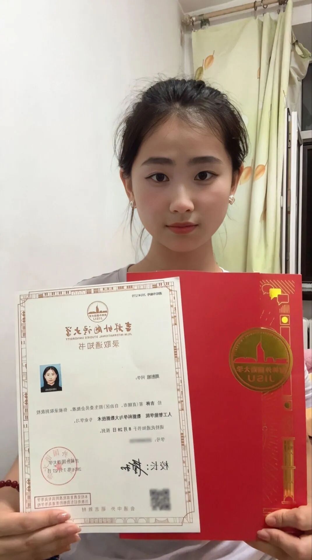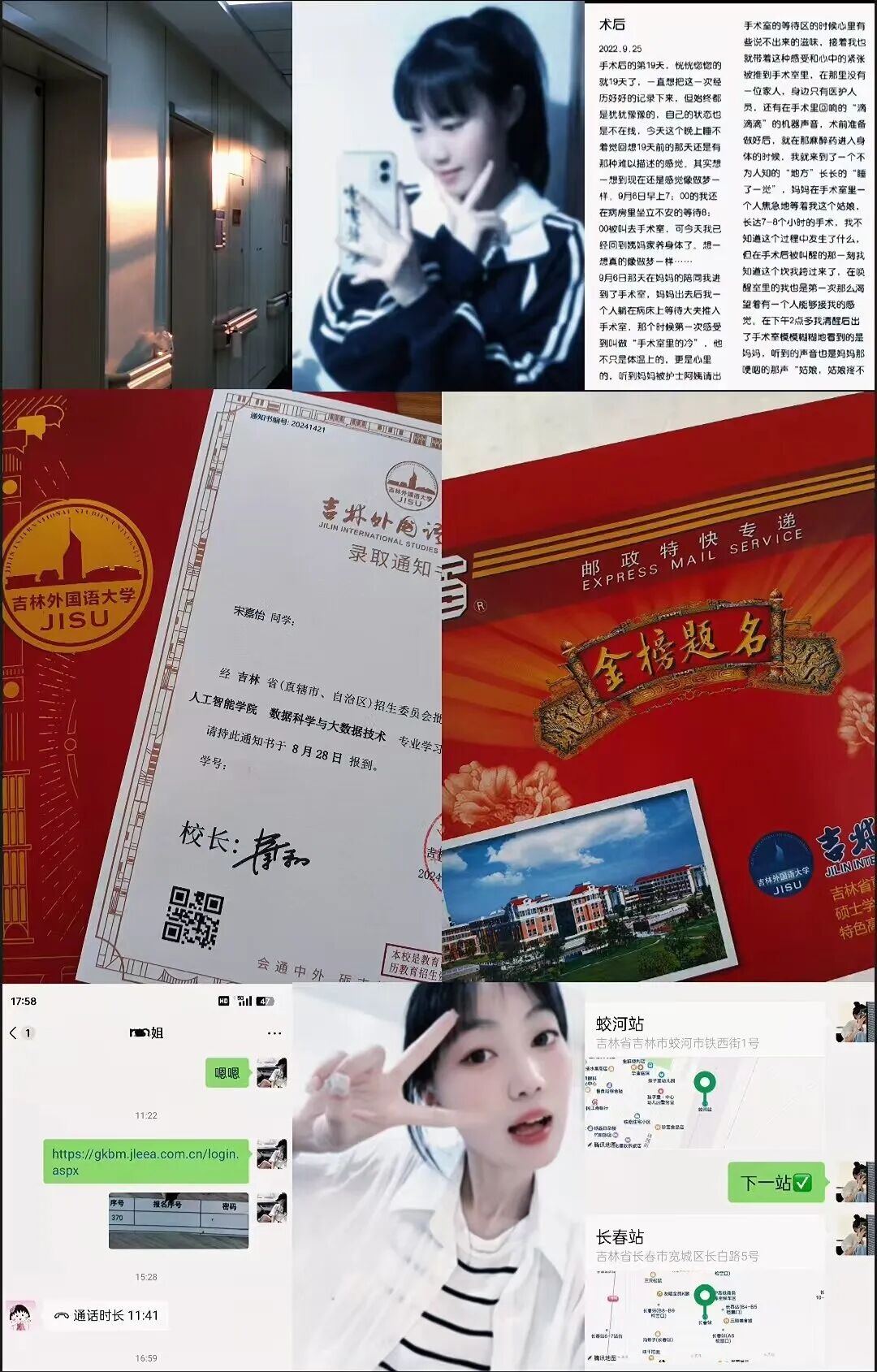 2021—2024 三年时间匆匆而过,转眼间,已是吉林外国语大学的一份子了。回首这三年,图片中最为上面的那三张可谓是足以讲述我的那三年了。我的高中生活中不仅仅有本属于高中生的那份艰辛劳累和独属于高中的那份风华正茂,还有就是病痛的“洗礼”——脊柱侧弯手术。深刻地记忆着,这台手术是在我高二的时候做的,高二正是高中最为重要的时刻,但是就在那时,我“倒”下了。术后修养的阶段我也犹豫过是否要走单招,可我很庆幸的是我做了一份坚定且正确的选择——高考。可是由于手术这份昂贵的费用,我这本不富裕家庭已经无法为我担负额外的补课费用,就这样我抱着背水一战的决心完成了我高中三年的学业,并且走上了高考的战场,最终很幸运且惊喜地被吉外录取(还是表姐帮我查到的,很惊喜)。现在再看看那份录取通知书,可能,在6.15号那天的咨询会上 就已经默默地定下了我与吉外的缘分吧[玫瑰]现在身为吉外的大学生,未来四年仍需继续砥砺前行, 路漫漫其修远兮,吾将上下而求索。期待着踏上吉外土地的那天。