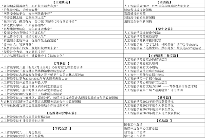 人工智能学院团委坚持以习近平新时代中国特色社会主义思想为指导,深入学习贯彻党的二十大精神,在学校党委和上级团组织的正确领导下,紧紧围绕学校中心工作,举办了“人工智能 2022-2023 学年学风建设暨志愿者表彰大会”、迎新晚会、防艾滋病宣传活动,辩论赛、最美笔记、瓦萨冰雪节天使选拔等活动。人工智能学院团委以坚定践行 "为党育人、为国育才" 为使命担当,引导学生们坚定理想信念,以服务青年学生成长成才为宗旨,以加强思想政治教育为核心,以丰富校园文化活动为载体,以加强团的自身建设为基础,团结带领广大团员青年为学校的改革发展贡献了青春力量。