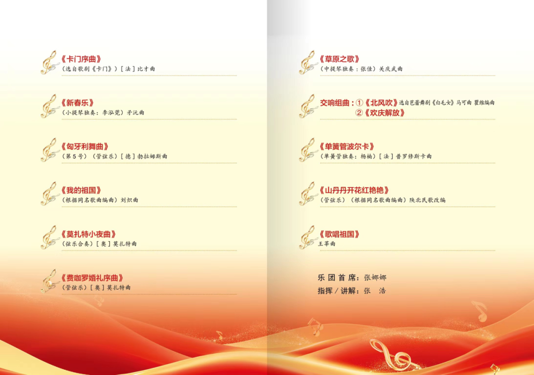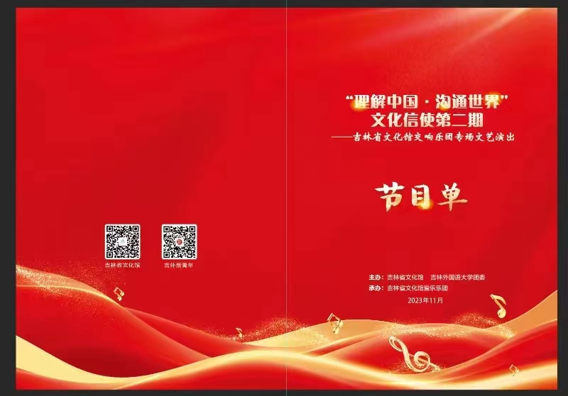 “理解中国·沟通世界”文化信使第二期——吉林省文化馆交响乐团专场文艺演出将于本周四下午两点在世桥大厦报告厅举行,本次演出由吉林省文化馆、吉林外国语大学团委主办,吉林省文化馆爱乐乐团承办,共包含11个节目。