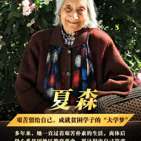 夏森——中国社会科学院原外事局研究员,爱党爱国、服务人民、淡泊名利、清廉自律、勤奋工作。早年投身革命,晚年心系老区教育。她认为,扶贫重在扶教,治穷先治愚。她是这样说的,也是这样做的。98岁的老人,一生艰苦朴素,却累计捐出200多万元用于改善贫困乡村学校的教学条件,目前已资助180多名贫困大学生圆了“大学梦”。