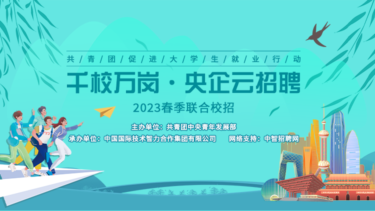 为扎实开展2023届及2022届未就业毕业生线上线下就业服务,全力推进“共青团促进大学生就业行动”,共青团中央青年发展部联合中国国际技术智力合作集团有限公司继续开展2023春季联合校招“千校万岗·央企云招聘”就业服务活动。