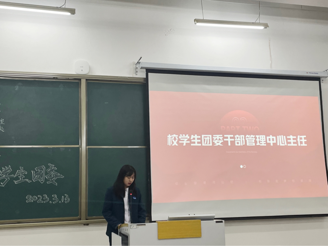 学生团委副书记赵相鹏同学、秘书长孙宇慧同学、办公室主任姜山同学、干部管理中心主任杨钰婷同学、第二课堂管理中心主任肖博文同学、综合外联中心主任于晴同学分别进行自我介绍,接下来是各部门的副部及干事进行了自我介绍。