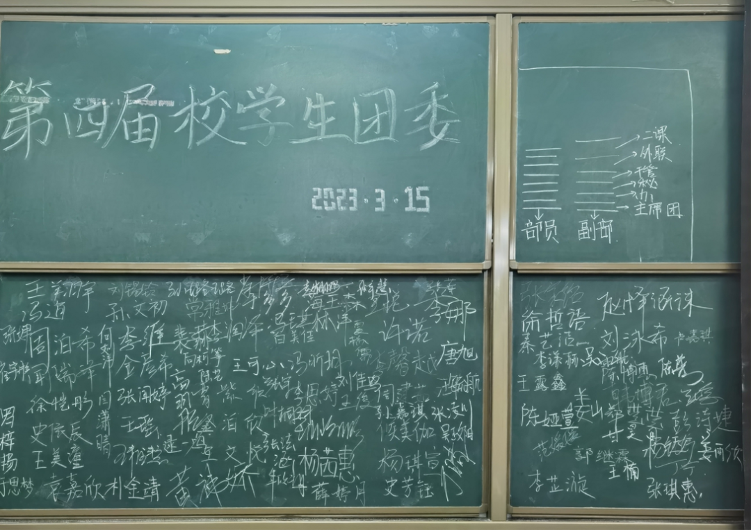 会议开始前大家有序签到,在黑板上写下自己的名字,校学生团委主席团成员代表校团委全体学生干部向新加入的同学表示热烈的欢迎。