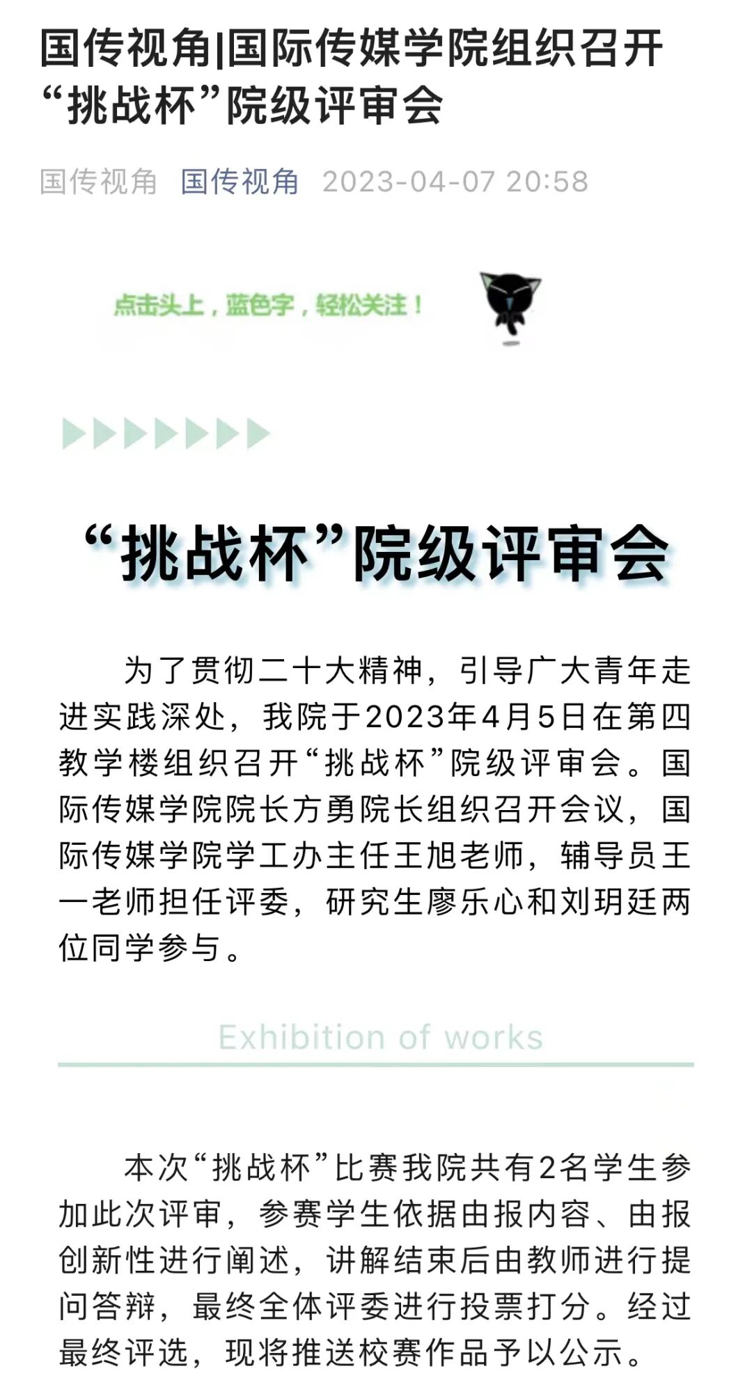 国际传媒学院于2023年4月5日组织召开第十八届“挑战杯”吉林省大学生课外学术科技作品院级评审会。依据由报内容、由报创新性进行阐述,讲解结束后由教师进行提问答辩,最终全体评委进行投票打分。经过最终评选,廖乐心同学的作品——“初中语文小说教学有效性教学研究”和刘玥廷同学的作品——“学习任务群视域中课文的价值功能与单元教学设计—以统编版高中语文教材必修上册第三单元为例”代表学院参与校赛。