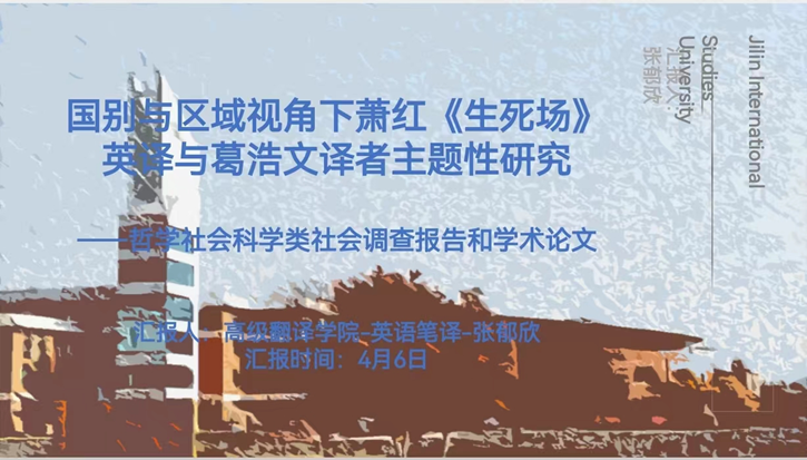 高级翻译学院于4月6日组织开展了高级翻译学院2023年“挑战杯”大学生课外学术科技作品竞赛的评审会。本次评审成员由院长助理马春晓老师、学工办主任孙菁华老师、团委书记张文秀老师以及多名学生代表共同组成。经过学生汇报答辩,评审成员一致同意将张郁欣同学的“国别与区域视角下萧红《生死场》英译与葛浩文译者主题性研究”项目推送至校赛。