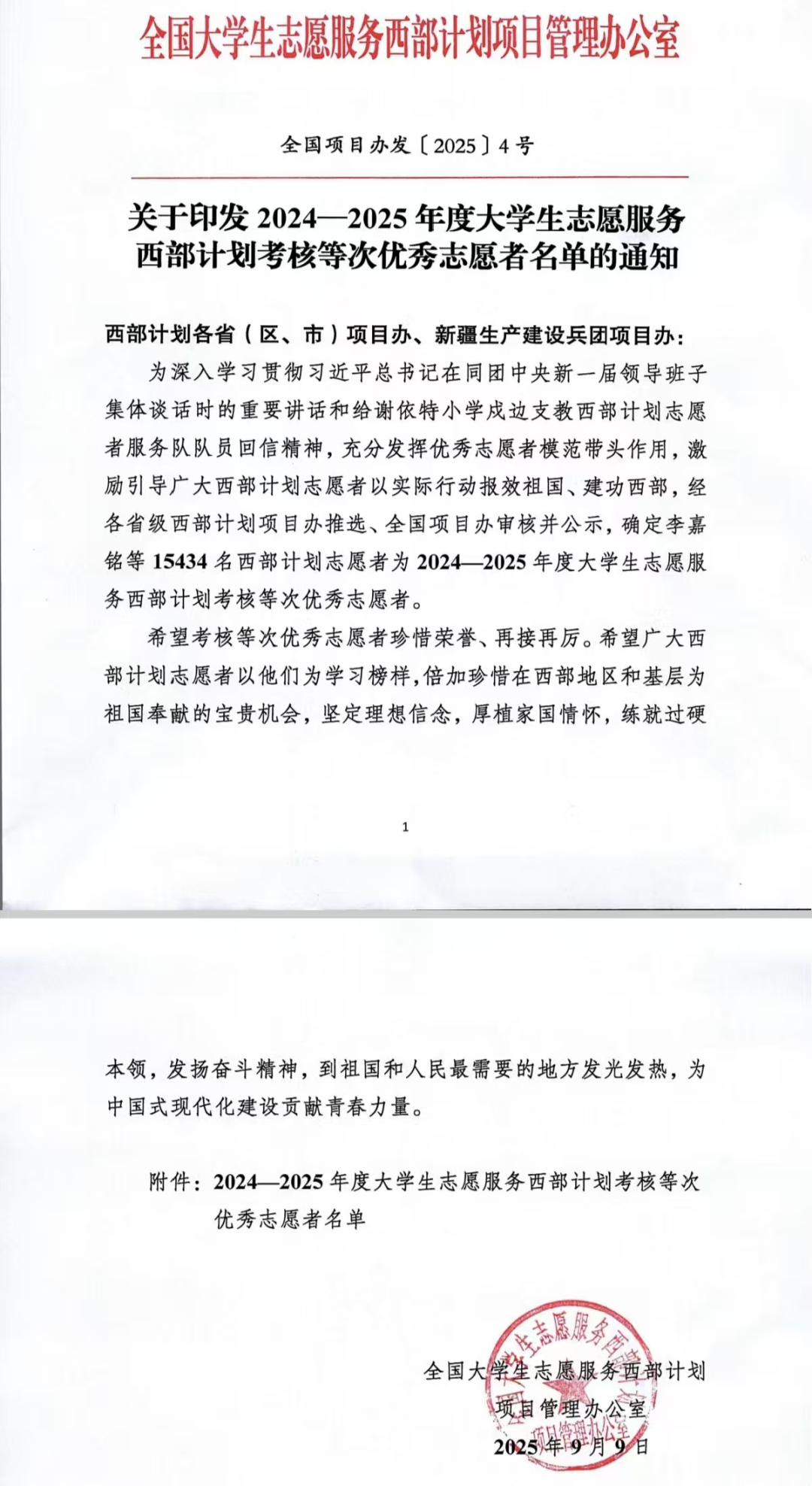 全国大学生志愿服务西部计划管理办公室印发2024-2025年度大学生志愿服务西部计划考核等次优秀志愿者名单,我校学生陈琳在考核中获评“优秀”等次,展现了我校学子在志愿服务领域的卓越风采与责任担当。