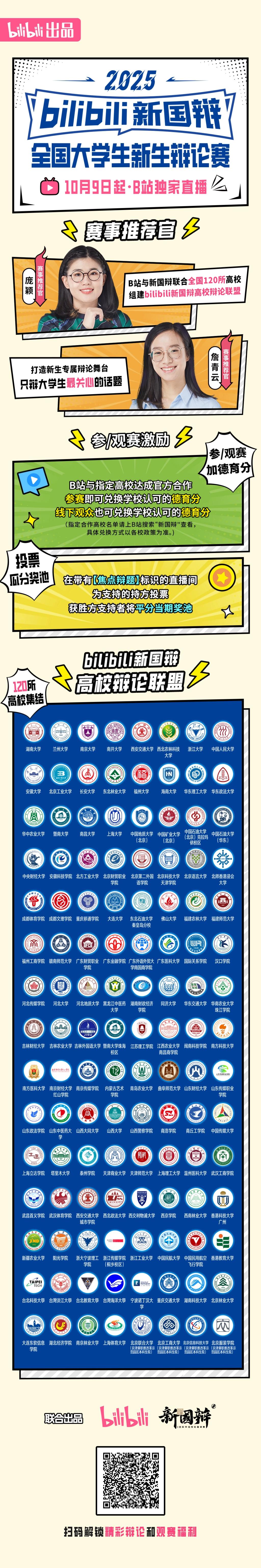 赛事全程将在B站独家直播,知名辩手詹青云、庞颖担任赛事推荐官,邀你围观最敢说的05后辩手激情开辩!详情上B站搜索“新国辩”,更有投票瓜分奖池福利,空降赛事直播间!